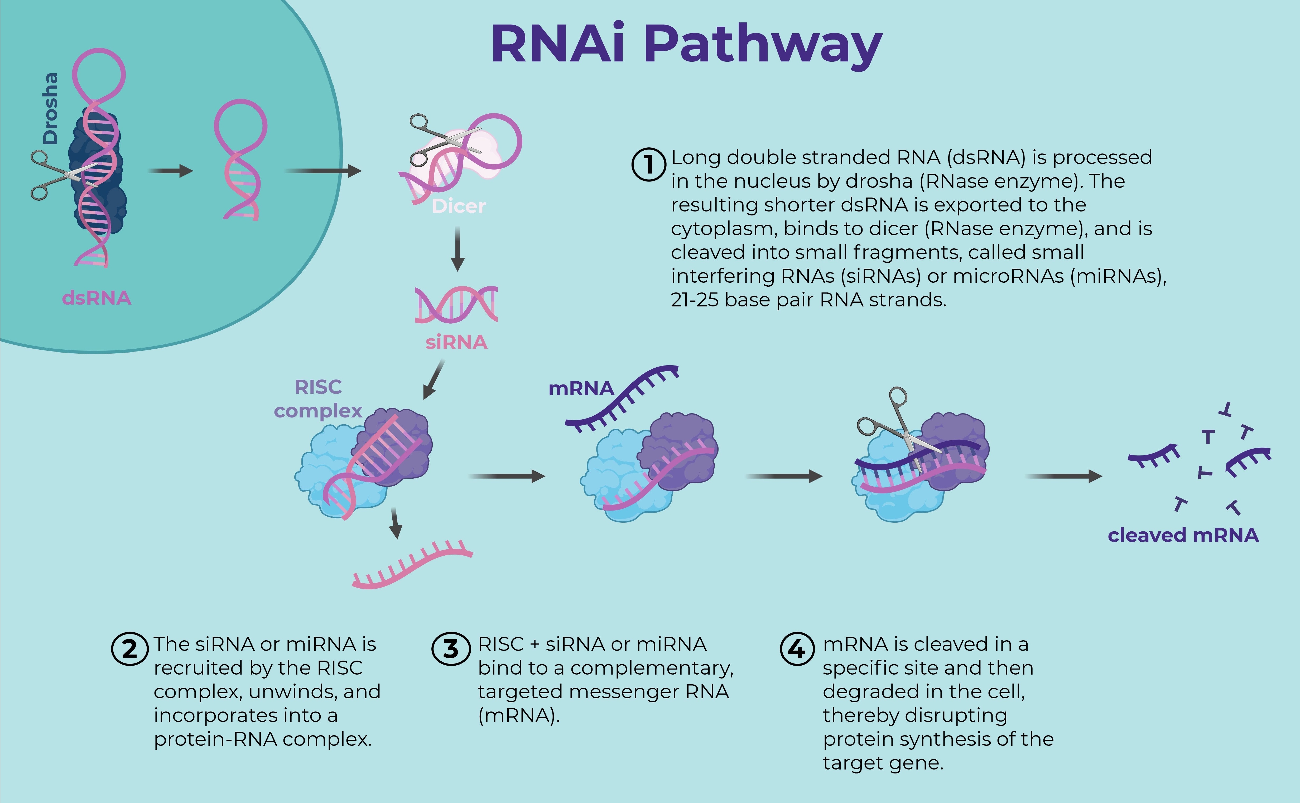 단백질을 만들지 않게 하는 'RNAi(RNA 간섭)'의 메커니즘을 정리하면 다음과 같다.