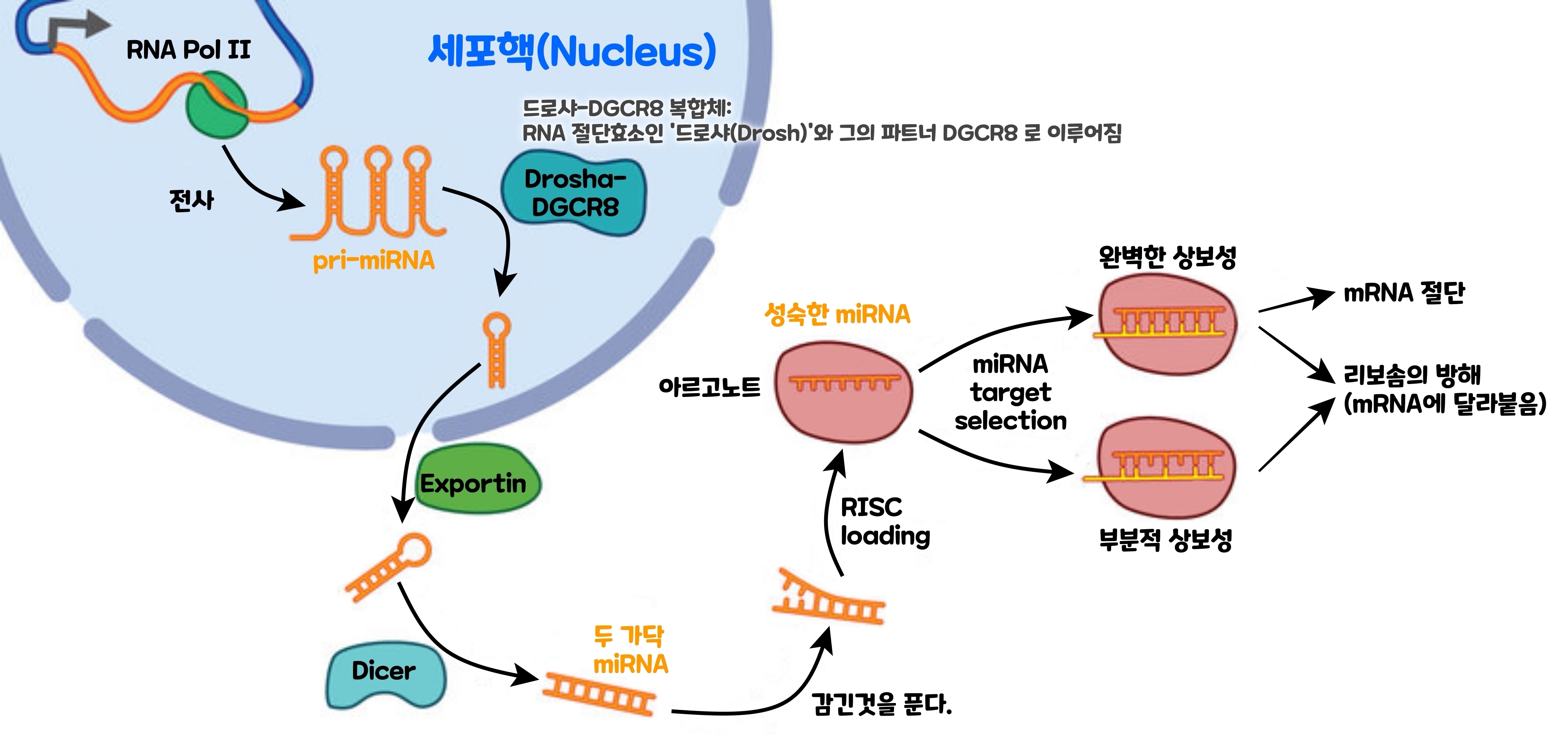 - 1-a: 스스로 두 가닥 사슬을 만든다: 사람을 포함한 진핵생물은 유전자로부터 작은 RNA를 만든다. 작은 RNA의 전구체는 mRNA와 마찬가지로 핵 안에서 만들어진다. 작은 RNA의 전구체는 한 가닥의 RNA인데, 자신 안에 쌍이 되는 염기의 배열을 갖는다. 그래서 일부가 두가닥 사슬이 된다. 이 두 가닥 사슬이 된 부분이 잘려 떨어져나가, 핵의 밖으로 운반된다.