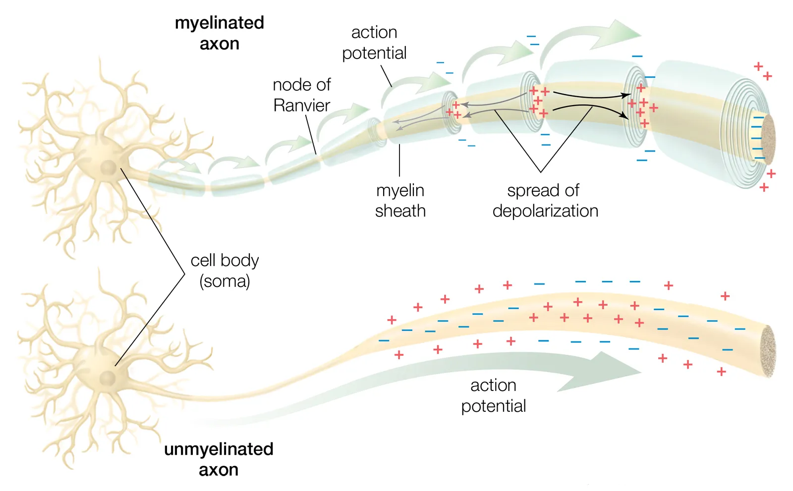 뉴런이 전기 신호를 발신하고, 그 신호가 축삭을 지나가는 기본적인 메커니즘을 설명했다. 축삭의 대부분은 '글리아 세포'의 일종으로 절연체 역할을 하는 '올리고덴트로사이트(Oligodendrocyte)'의 일부가 감싸고 있다. 군데군데 절연체로 감기지 않은 부분이 있는데, 그 부분을 '랑비에 결절(node of Ranvier)'이라고 한다. '랑비에 결절'의 주변에는 관문을 열어 이온이 통과하는 '이온 채널'이 있다. 그곳에서 이온의 유입·유출이 일어난다. 이러한 연쇄 작용이 뉴런을 지나는 전기 신호의 정체이다.