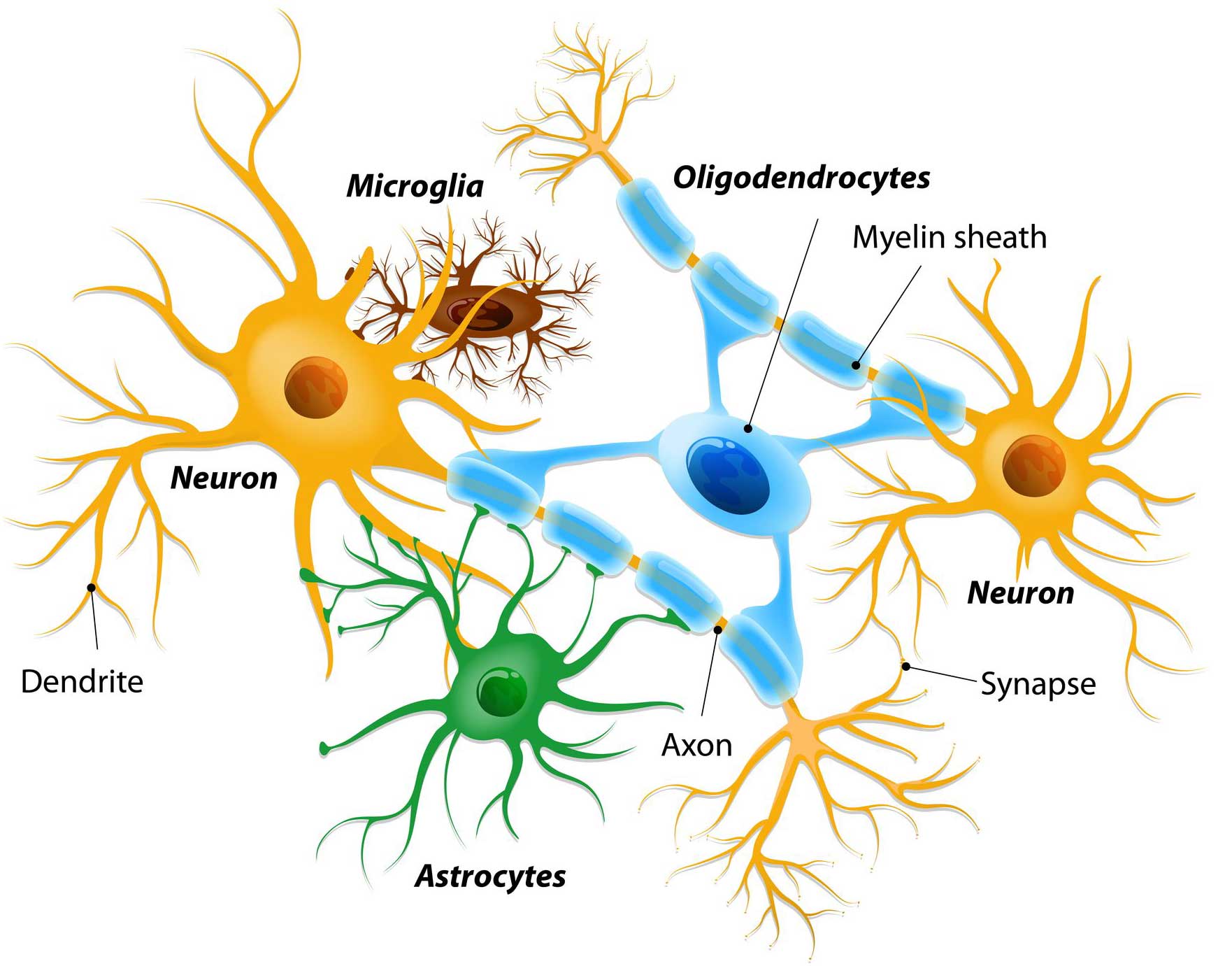 뉴런 속은 전선보다 훨씬 전기 저항이 커서, 전기가 흐르기 어렵다. 일부 뉴런에서는 그 전달을 '글리아 세포'가 돕고 있다. 바로 '올리고덴드로사이트(Oligodendrocyte)'이다. '올리고덴드로사이트(Oligodendrocyte)'라는 이름은 '수목(dendro-)'같은 돌기의 수가 '아스트로사이트'보다 '적게(Oligo-)' 관측된다는 데서 유래했다고 한다.