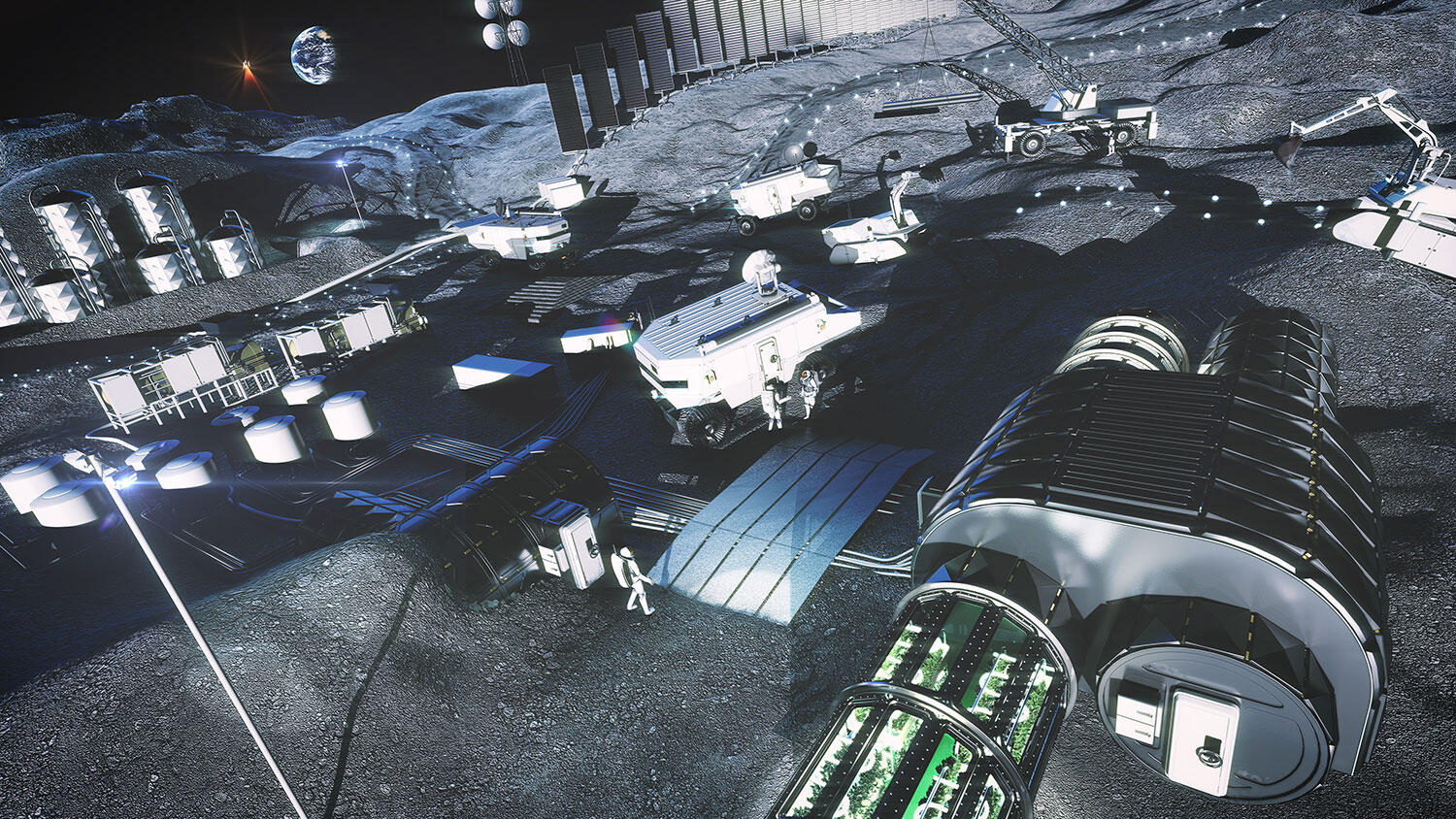- 전기 비축하기: 달에 처음으로 도착한 선발대는 한동안 착륙선 캡슐을 기지로 활용하면서 가끔씩 밖으로 나가 태양 집열판을 펼쳐놓아야 한다. 달의 하루는 지구의 한 달에 해당하기 때문에 약 2주에 걸친 낮과 밤이 주기적으로 반복된다. 따라서 밤에 전기를 사용하려면 낮 시간 동안 충분한 양의 전기를 비축해둬야 한다. 또 달의 극지방의 산악지대는 1년 내내 영구 양지가 존재하기 때문에, 이곳에 태양 집열판 수천 개를 설치해 놓으면 에너지를 안정적으로 얻을 수 있다.