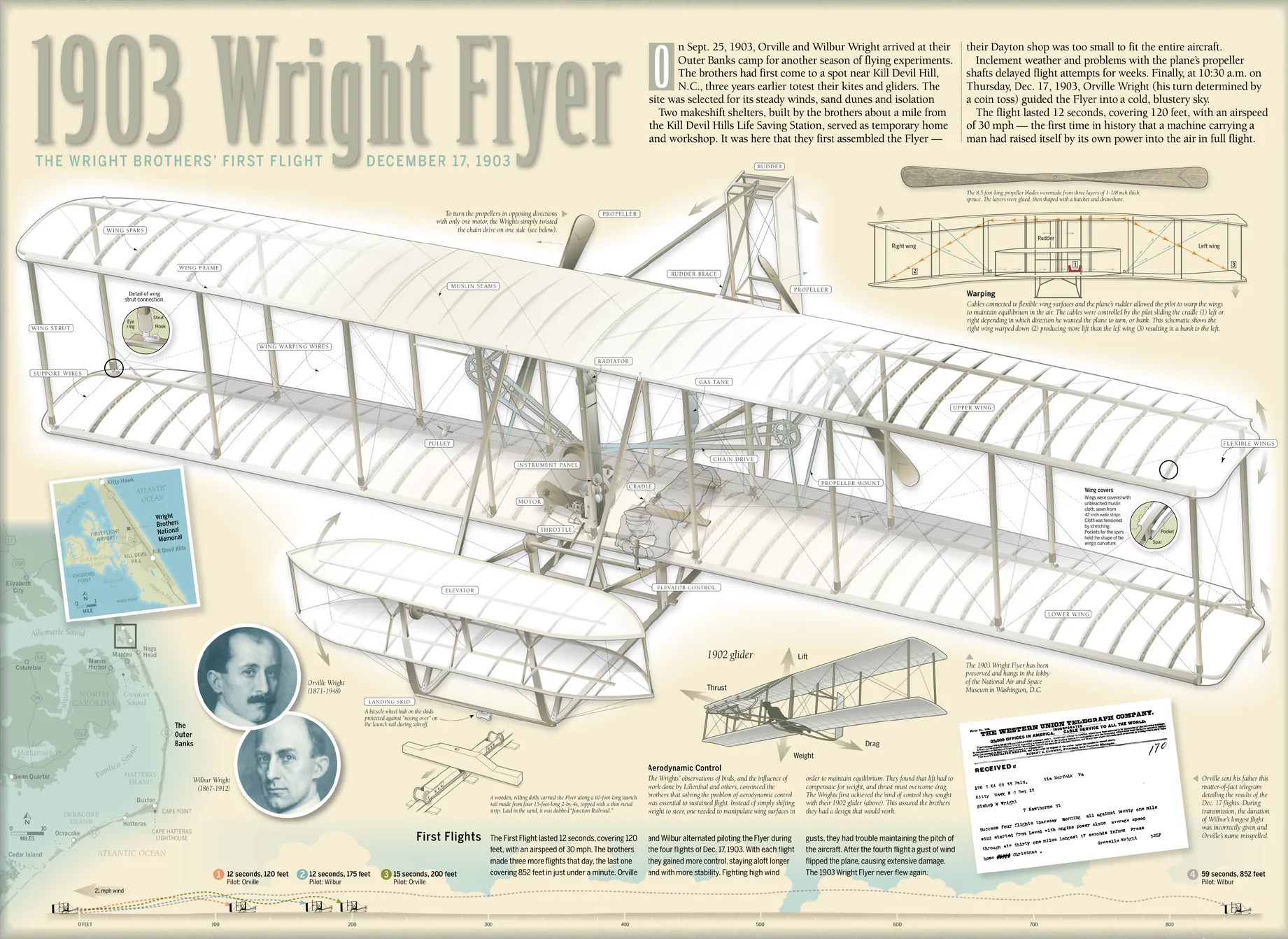 '라이트 플라이어 1호'의 첫 비행은 1903년 12월 14일에 미국 노스캐롤라이나주 '키티호크'에서 시도되었다. 동전을 던진 결과 조종자는 형 '윌버 라이트(Wilbur Wright)'로 정해졌지만, 비행은 실패하고 기체는 파손되었다. 그 수리를 마친 12월 17일, 다시 첫 비행에 도전했다. 이번에는 동생 '오빌 라이트(Orville Wright)'가 조종할 차례였다.