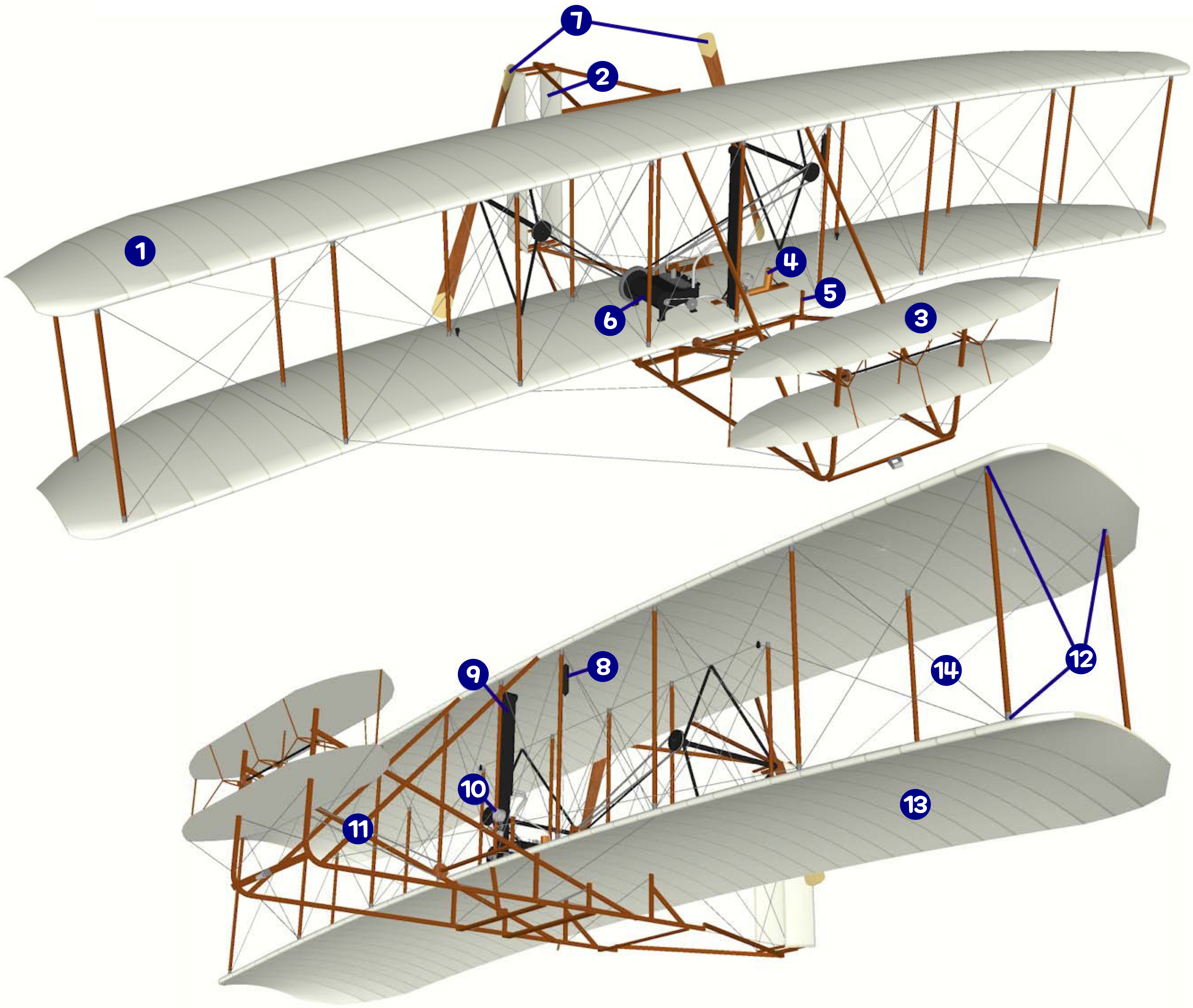 - Rigging: To hold the air frame rigid, the Wrights rigged their Flyer with 15-gauge bicycle spoke wire, running diagonally between the ends of the struts to create a strong but lightweight truss.