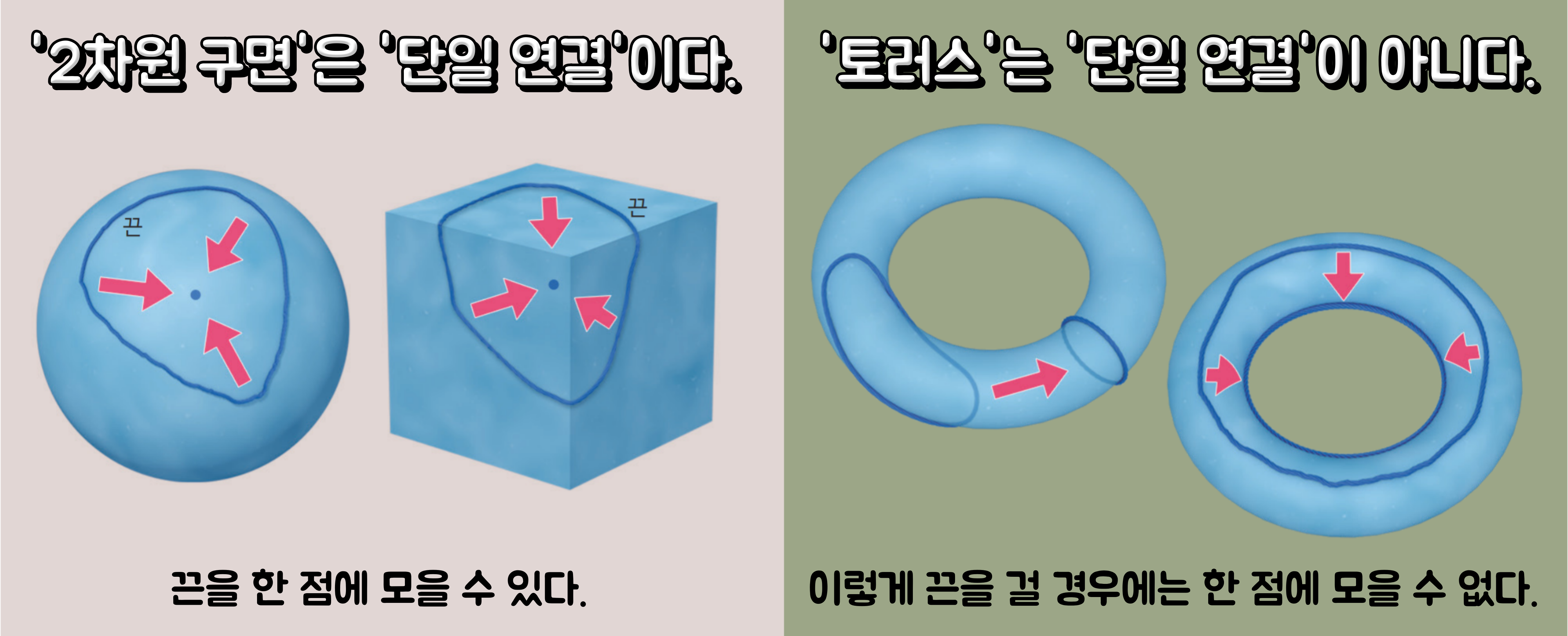 - '토러스'는 '단일 연결'인가?: '2차원 닫힌 다양체'에 달라붙게 끈을 걸었을 때, 원래의 입체가 공이든 정육면체이든 '토러스'와 위상동형인 경우, 끈을 거는 방식에 따라서는 끈을 한 점에 모을 수 없다. 아래 그림에 나타낸 토러스에 끈을 거는 2가지 방법으로는 어느 경우에도 끈을 한 점에 모을 수 없다. 이것은 구멍의 수가 2개 이상인 경우라도 마찬가지이다. 즉, 토러스처럼 구멍이 1개 이상 뚫린 '2차원 닫힌 다양체'는 '단일 연결'이 아니다.