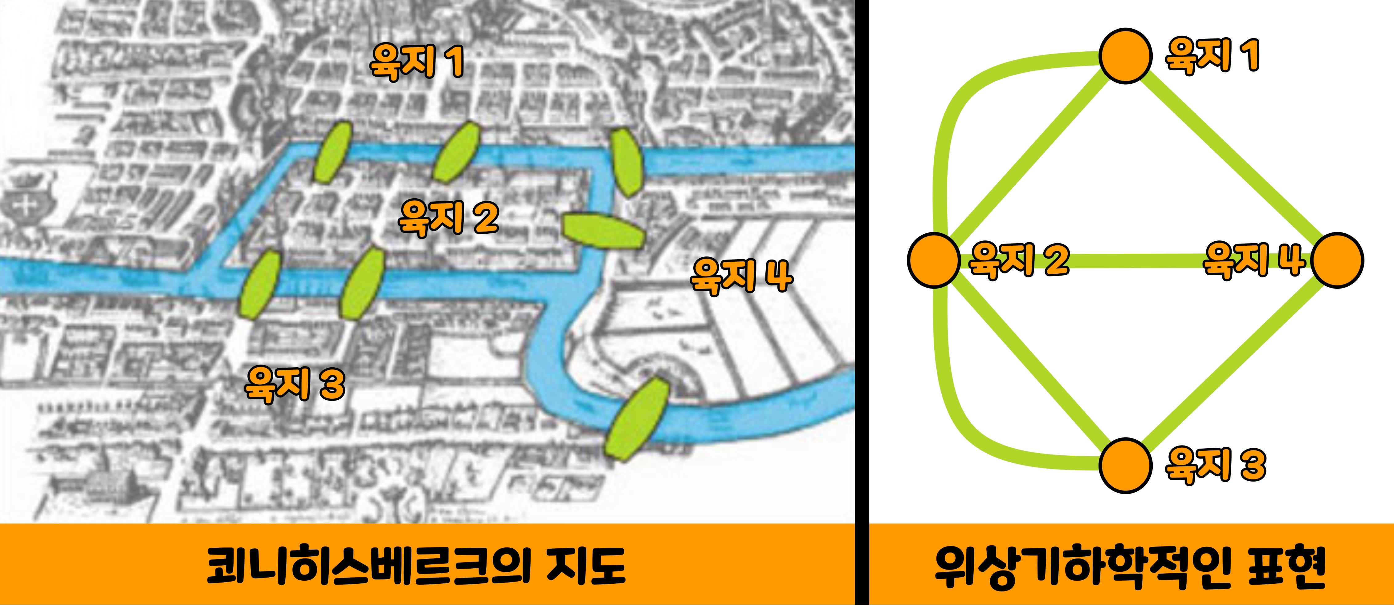 '레온하르트 오일러(Leonhard Euler)'가 활약한 시대에 유럽의 '발트해(Baltic Sea)' 남쪽 해안 '동프로이센(Ost Preussen, 옛 독일제국 북동부에 본토와 분리되어 있었던 영토)'에 '쾨니히스베르크(Königsberg)'라는 도시가 있었다. 현재는 러시아의 고립된 영토인 '칼리닌그라드(Калинингра́д, Kaliningrad)' 지역이다. 이 도시는 '쾨니히스베르크 대학교' 교수였던 철학자 '이마누엘 칸트(Immanuel Knat, 1724~1804)'가 생애를 보낸 곳으로도 알려져 있다. 이 도시의 중심에는 '발트해'로 흘러드는 큰 강이 있었다. 강 가운데의 모래톱에도 시가지가 형성되었으며, 모래톱 부근에는 7개의 다리가 있었다. 어느 날 누군가 '어떤 지점에서 출발해 다리 7개를 모두 1회씩 건너 원래의 지점으로 돌아올 수 있을까?'라는 문제를 던졌다. 이 문제에 대해 수학적인 해답을 제시한 사람이 바로 '레온하르트 오일러'이다.