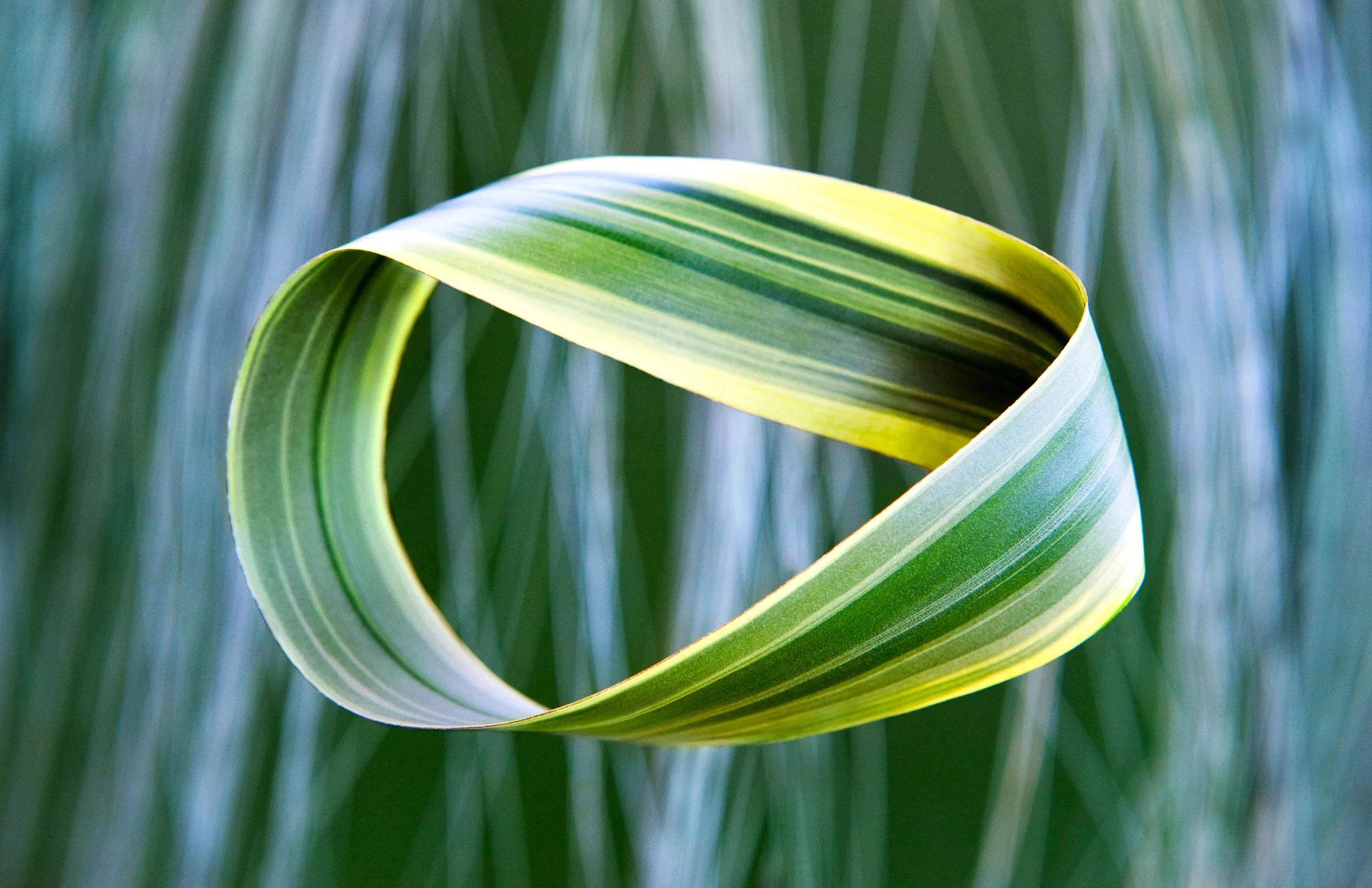 '위상수학'에서 자주 등장하는 도형 중에 '뫼비우스의 띠'가 있다. 독일의 수학자 '아우구스트 페르디난트 뫼비우스(August Ferdinand Möbius, 1790~1868)'가 1858년 무렵에 발견한 '곡면(휘어진 면)'이다. '뫼비우스의 띠(Mobius strip)'란 가늘고 긴 띠를 180° 비틀어 끝과 끝을 연결한 것이다. 이 도형은 띠의 바깥쪽을 더듬어 가면, 안쪽으로 돌아갔다가 다시 바깥쪽으로 되돌아오는 기묘한 성질이 있다. 즉, 안과 밖이라는 개념이 없다. 무한히 더듬어 갈 수 있기 때문에 '무한대(∞)'를 상징하는 도형으로 사용되는 경우도 많다.