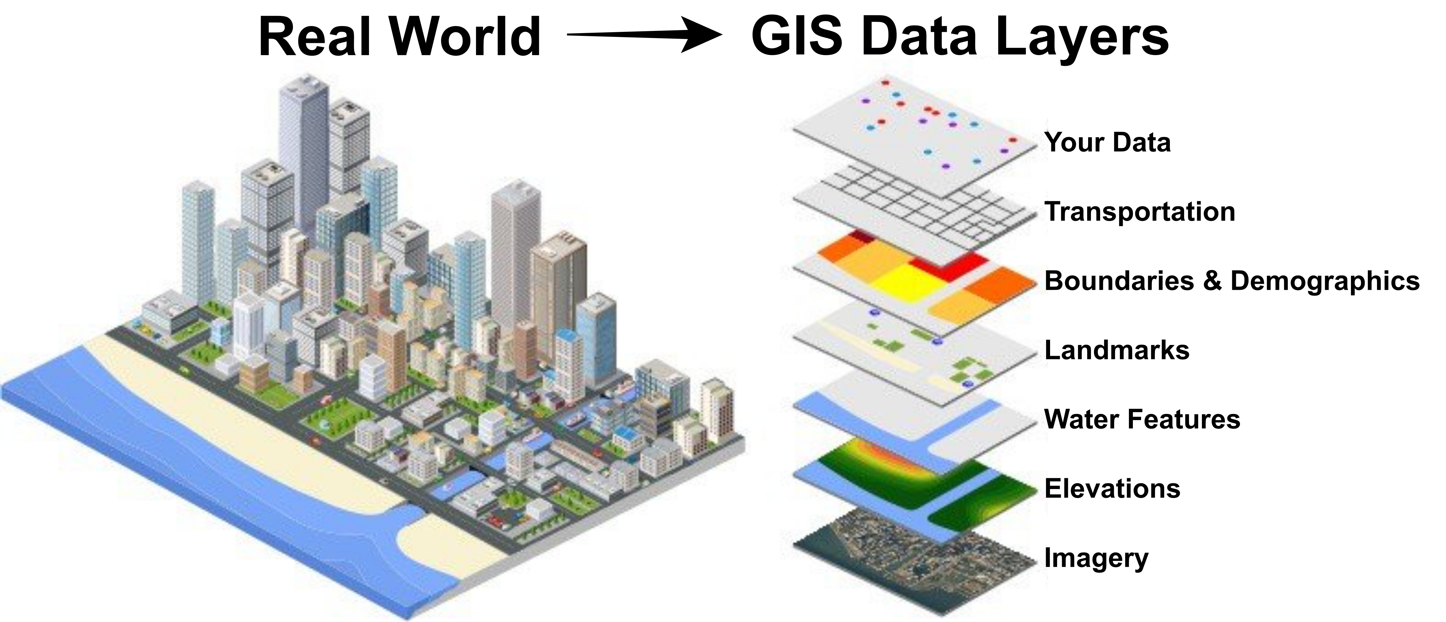 GIS의 중요한 특징은 여러 가지 공간 정보를 컴퓨터에서 중합시킴으로써 정보를 눈으로 보고 알기 쉽게 표시해 정보를 분석·가공·관리할 수 있다는 것이다. 중합된 정보로부터는 하나의 정보만으로 볼 수 없었던 것들을 볼 수 있다. 일반적으로 GIS의 데이터 구조는 '면 데이터', '선 데이터', '점 데이터'의 3종류의 '층(Layer)'으로 이루어진다. 예컨대 면 데이터 층에는 '토지의 고저와 지형' 등의 상태를 나타내는 '토지 조건도'를 나타낼 수 있다. '토지 조건도'란 토지의 고저와 지형 등의 상태를 나타내고 있어 재해 위험도를 평가할 수 있다. 그 위에 '도로', '철도', '하천', '재해로 인한 자동차와 열차의 통행 불능 개소'를 나타낸 선 데이터를 겹친다. 그리고 마지막으로 '혼자 사는 고령자', '노후 목조 주택', '방재 시설의 분포' 등의 점 데이터 레이어를 겹치면 재해 때의 대피 경로와 대책을 분석하기 위한 지도가 완성된다. 이처럼 GIS는 단순한 지도 정보가 아니라, 그들 정보끼리 서로 어떻게 관련되어 있는지도 가시화할 수 있다.
