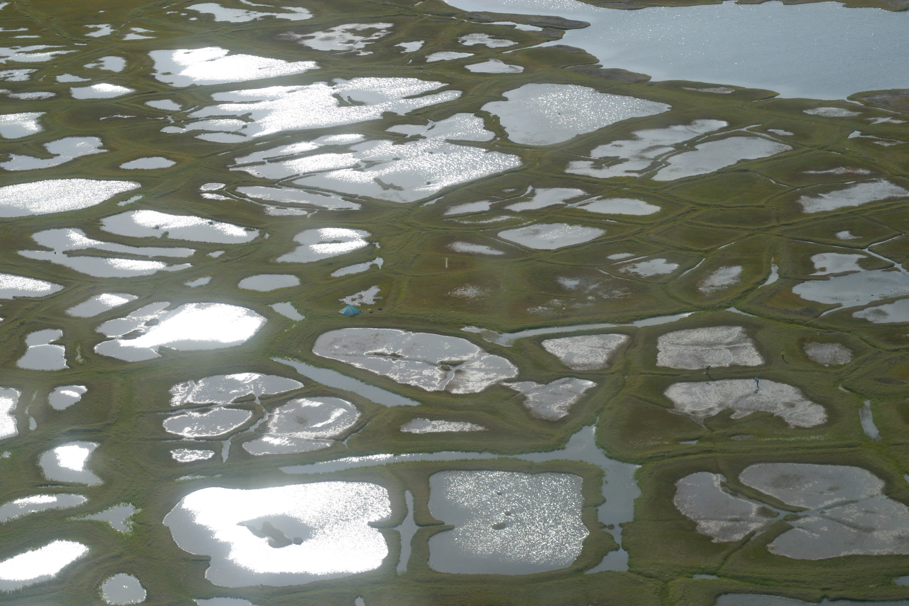 아래의 사진은 알레스카(Alaska)'의 영구 동토대에 펼쳐진 '툰드라(Tundra)'에 나타난 '열 카르스트(Thermokarst)' 지형이다. '열 카르스트'에서는 줄처럼 움푹 팬 것으로 구분되는 다각형 또는 원형의 무늬가 나타난다. 이것을 '폴리곤(Polgon)'이라고 하며, 땅속에 자연스럽게 생긴 영구 동토의 균열 균포를 나타낸다. 온난화로 균열을 일으킨 얼음이 녹아 큰 물웅덩이가 생기고, 이어서 융해가 진행되면 연못과 호수가 나타난다.