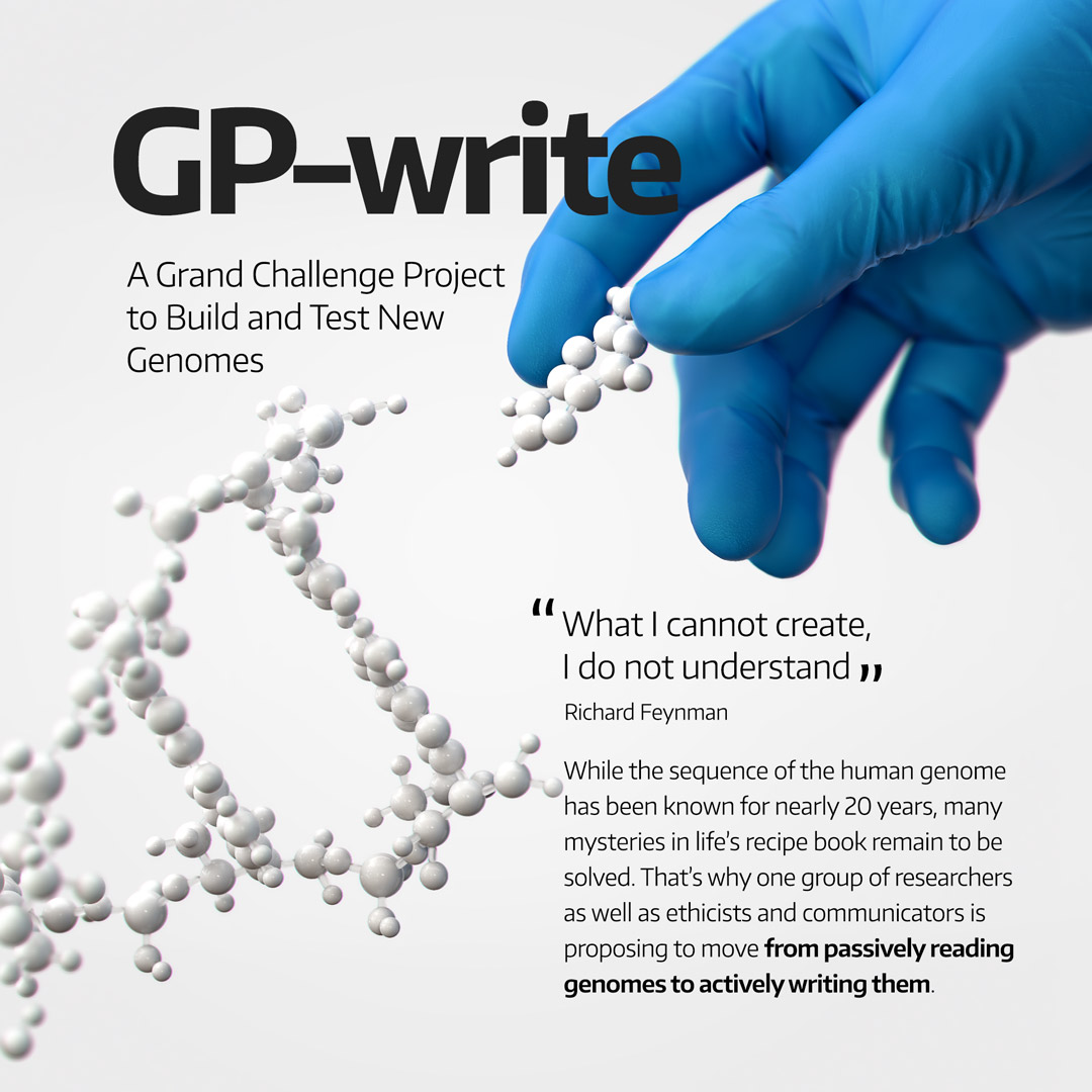 2016년부터 약 200명의 연구자가 참가해, 인간을 포함한 다양한 생물의 유전체 합성을 촉진하는 목적의 프로젝트 'GP-Write'가 시작되었다. GP란 'Genome Project(유전체 프로젝트)'의 약자로, 20세기 마루터 시작된, 인간의 유전체를 모두 해독하는 '인간 유전체 프로젝트(Human Genome Project)'에서 유래했다. Write는 '쓰다'라는 의미이므로, GP-Write는 인간 유전체를 쓰는, 즉 인공적으로 합성하기 위한 기술 개발을 국제 협조를 통해 가속화하는 것을 목적으로 한다.