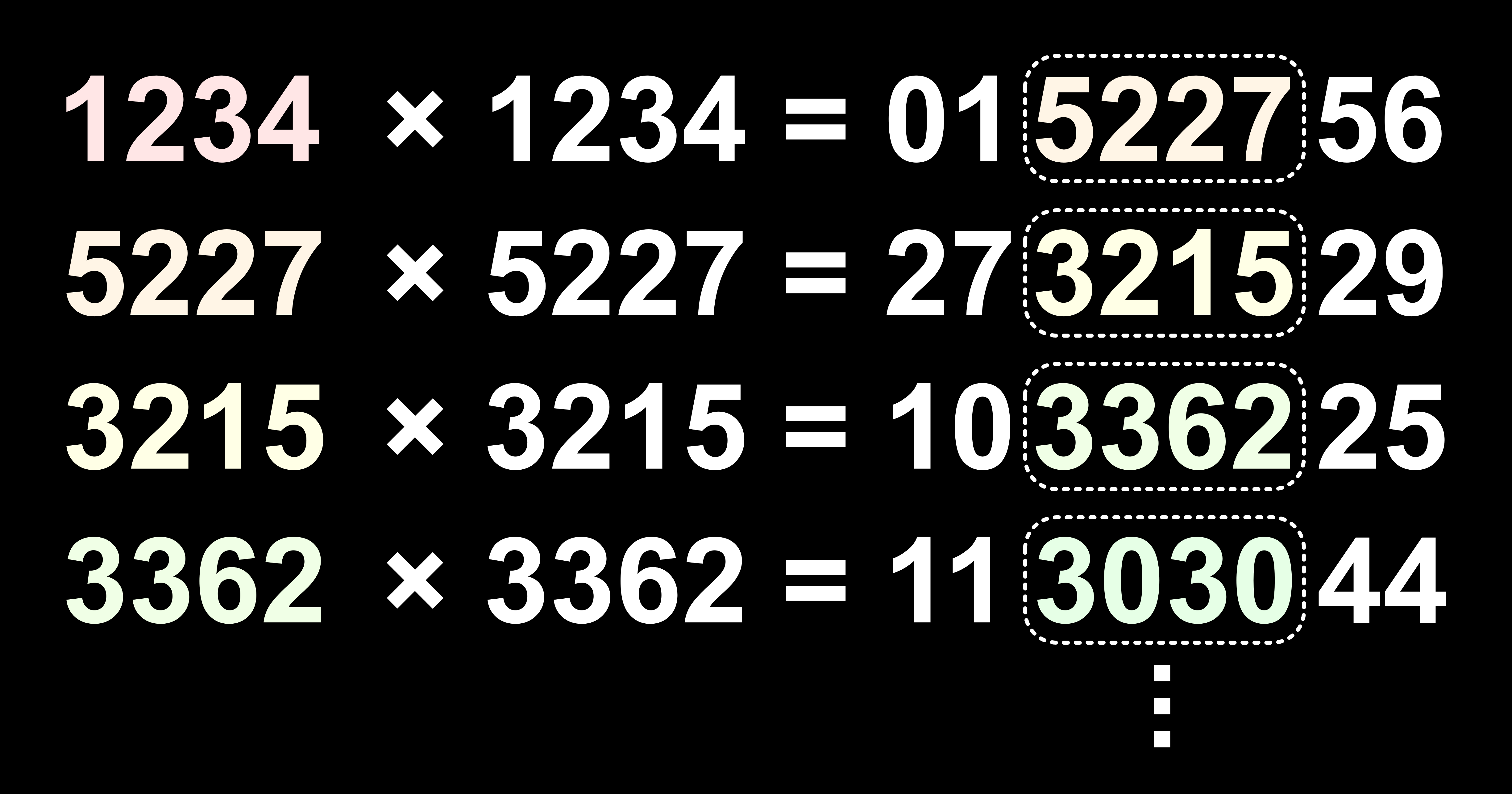 '재제곱 채중법(Midsquare Method)'을 이용해 4자리의 '의사 난수'를 만들어보자. 우선 시각표 등에서 '난수의 종자'가 될 4자리의 수를 택한다. 여기에서는 '난수의 종자'가 될 4자리의 수를 '씨앗'이라고 하자. '씨앗'을 제곱한 8자리의 수 가운데 4자리의 수를 첫 번째 의사 난수로 삼는다. 제곱해도 자릿수가 채워지지 않을 때는 0을 보충한다. 이 5227을 같은 방법으로 조작해 다음의 의사 난수 3215를 얻는다. 이것을 반복하며 차례차례 의사 난수를 만드는 것이 '재제곱 체중법(Midsquare Method)'이다.