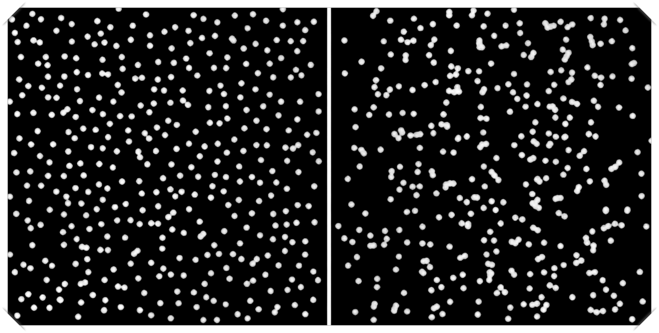또 하나의 클러스터 착각의 예를 소개한다. 미국의 유명 고생물학자이며 진화 생물학자인 '스티븐 제이 굴드(Stephen Jay Gould, 1941~2002)'는 저서 'BULLY FOR BRONTOSAURUS - Reflection in Natural History(1995)'에서 다음과 같은 이야기를 소개했다. '아래 2개의 그림 가운데, 점이 무작위로 분포한 것은 어느 쪽일까?'라고 묻자 많은 사람이 '왼쪽이 무작위'라고 대답했다. 그러나 실제로는 왼쪽은 점이 겹치지 않도록 의도적으로 배치한 것이고, 오른쪽은 무작위로 분포한 것이다. 왼쪽 그림에서는 의미가 있을 것 같은 패턴이 읽히지 않기 때문에 '더 무작위하다.'고 판단하기 쉽다.
