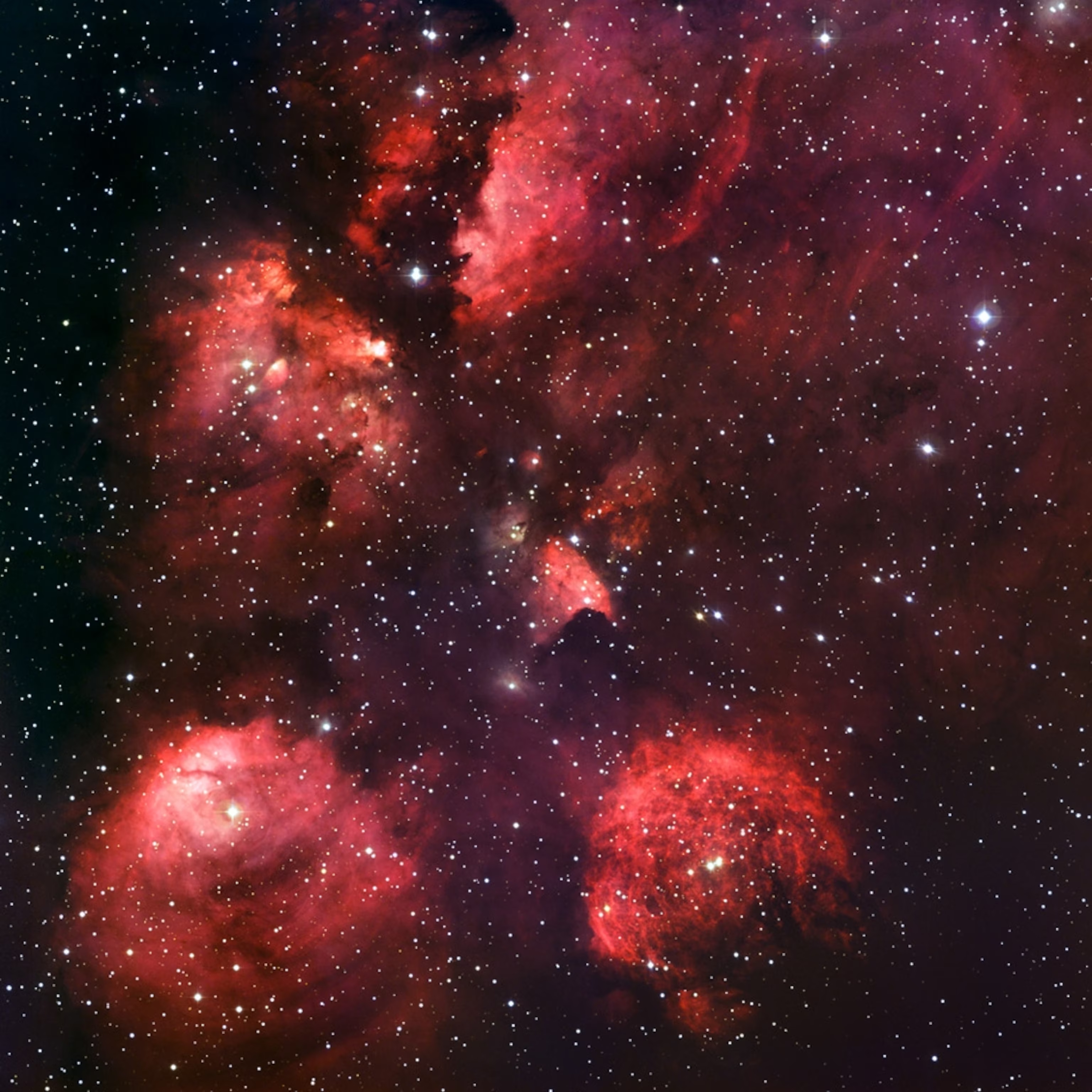 아래의 영상은 '고양이발 성운(Cat's Paw Nebula)'이라고 불리는 성운이다. 지구에서 약 5500광년 거리에 있다. 고양이발 안쪽에 있는 발볼록살처럼 보인다고 해서 '고양이발 성운'이라는 이름이 지어졌다. 이 성운 안에는 과거 수백만 년 동안 태양의 10배 정도의 질량인 별이 대량으로 만들어지고 있다. 그 항성에서 나온 자외선을 흡수해서 주위 가스가 빛을 방출하고 있다.