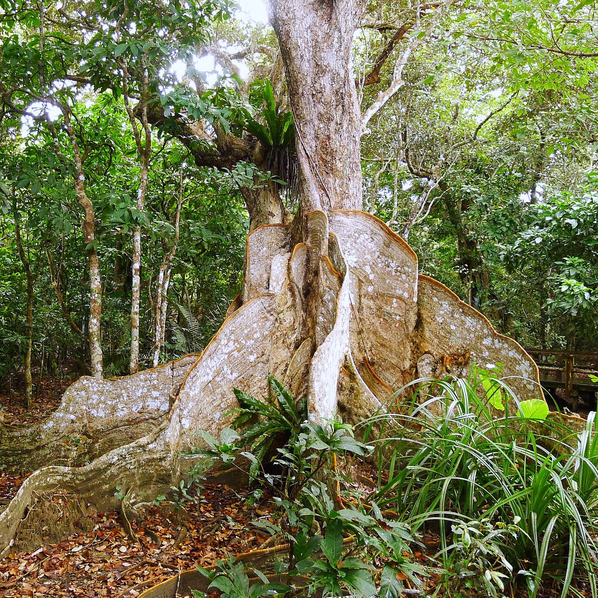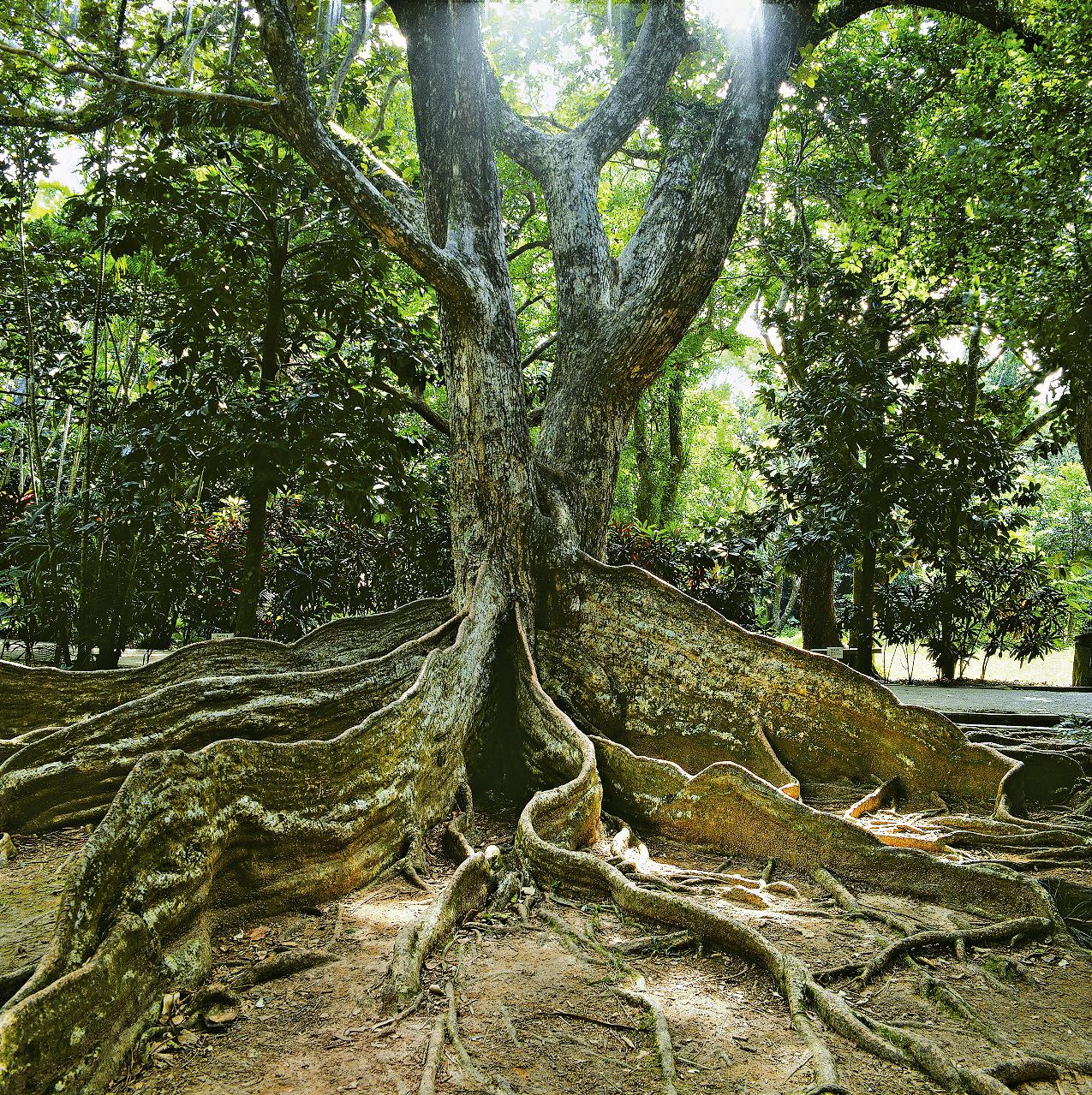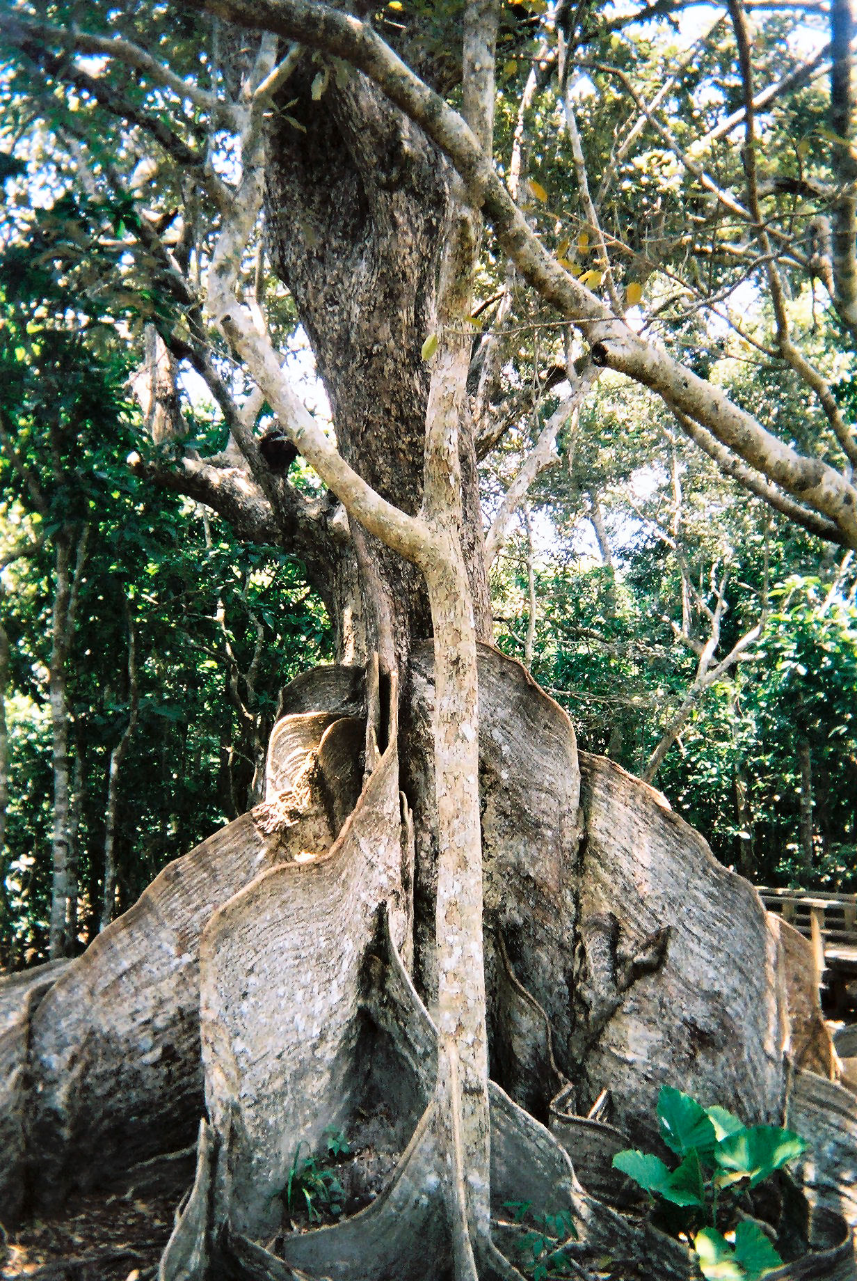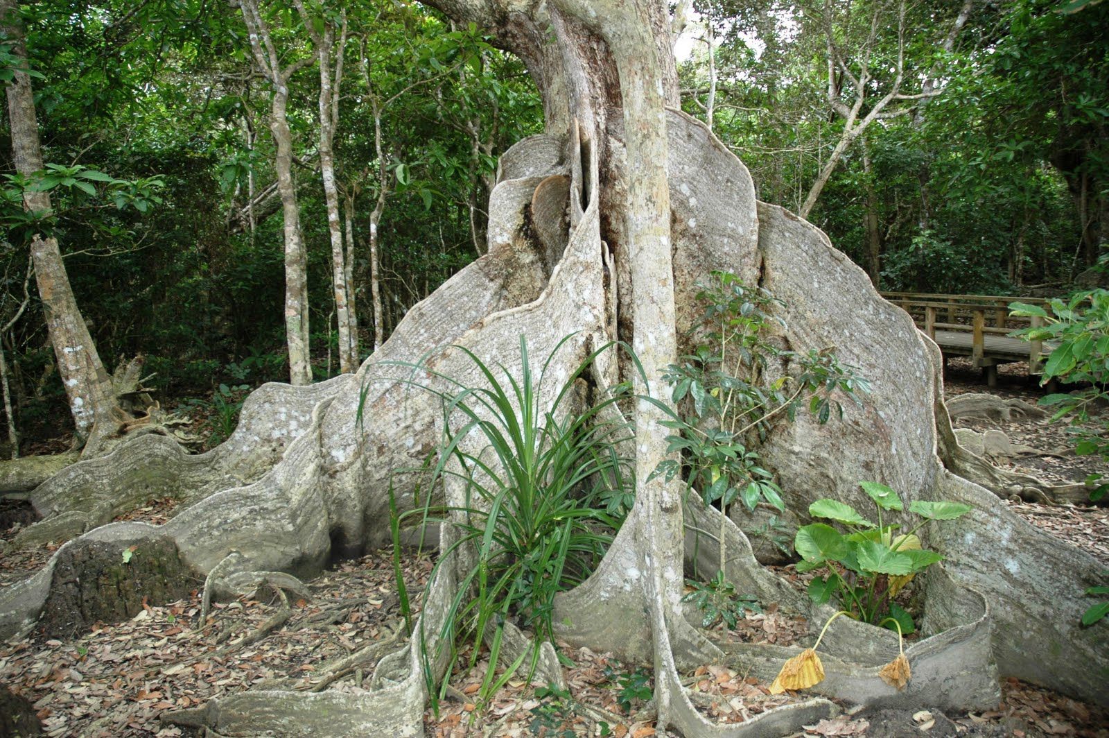 사진처럼 구불구불 구부러져 있는 거대한 '칸막이'는 '판근(Buttress Root)'이라는 뿌리이다. '헤리티에라 리토랄리스(Heritiera littoralis)'의 줄기의 근원에는 이런 거대한 '판근'이 나타난다. '판근'은 '지주근(Prop Aerial Root)'이 발달한 것이다. 줄기가 뻗은 지주근이 세로 방향으로 성장해 높아지고 단단해져서 이런 형태가 된다. 높이 4m 이상 되는 판근도 있다. 헤리티에라 리토랄리스는 나무 높이 20m, 어른 가슴 높이의 지름이 2m나 되는 거목이며, 반석 같은 뿌리는 이 거대한 몸을 지탱하는 역할을 맡는다.