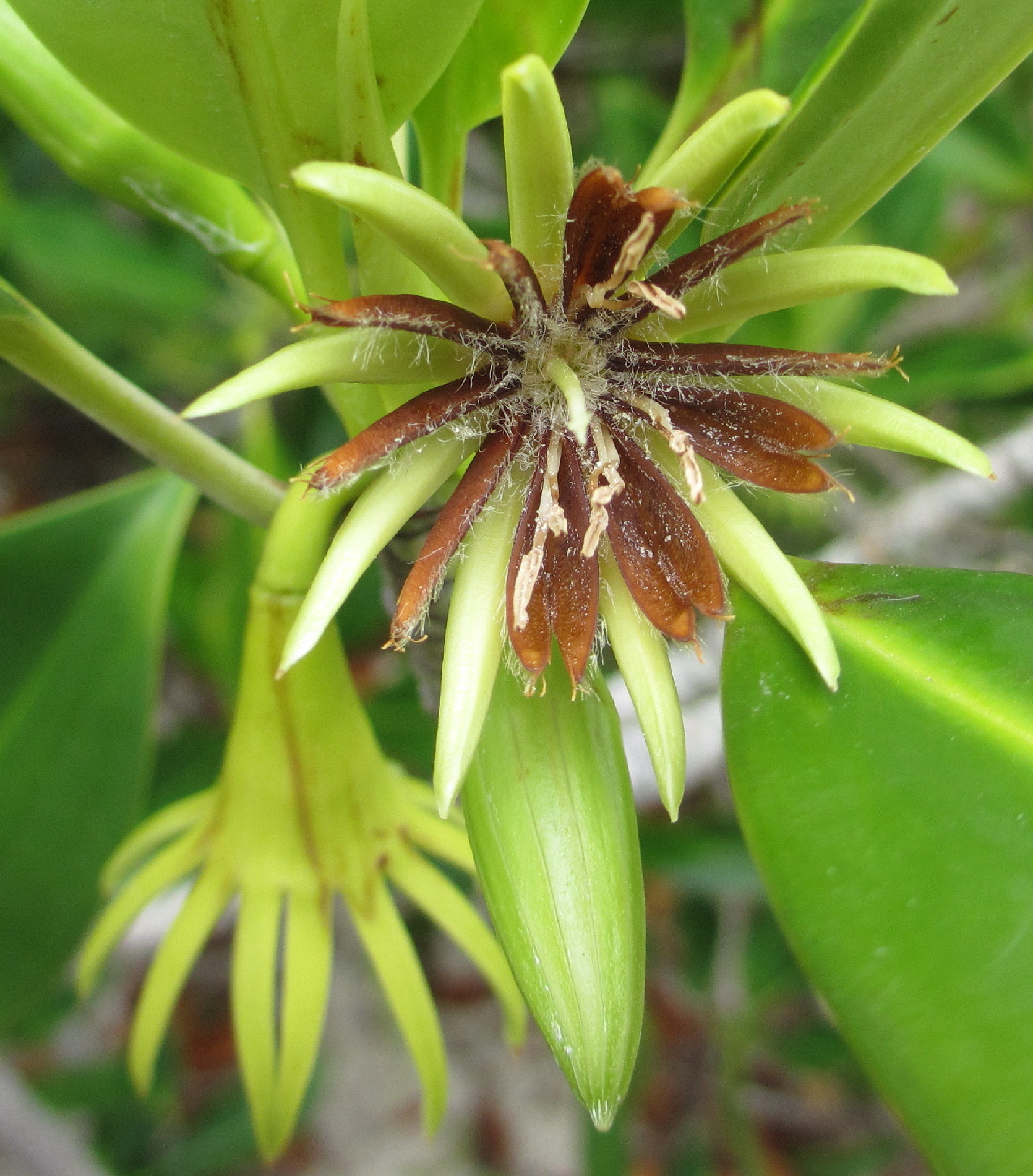 마지막 4개의 사진은 '브루기에라 김노르리자(Bruguiera gymnorrhiza)'의 꽃이다. 꽃잎처럼 붉게 보이는 것은 꽃받침이며, 실제 꽃잎은 꽃받침 속에 보이는 털에 돋아난 황토색 부분이다. 자세히 보면 꽃잎에는 중앙에 접힌 금 같은 것이 있다. 맨 처음에 꽃잎은 이 금을 따라 단단히 닫혀 있다. 화분을 운반해 오는 곤충이나 새가 이 꽃잎과 접촉했을 때 접촉한 자극으로 단숨에 꽃이 핀다. 꽃잎 속에는 각각 2개씩 수술이 들어 있으며, 꽃잎이 열렸을 때 수술의 화분이 날아감으로써 곤충이나 새에 달라붙는 구조이다. 꽃의 지름은 3cm 정도이다.