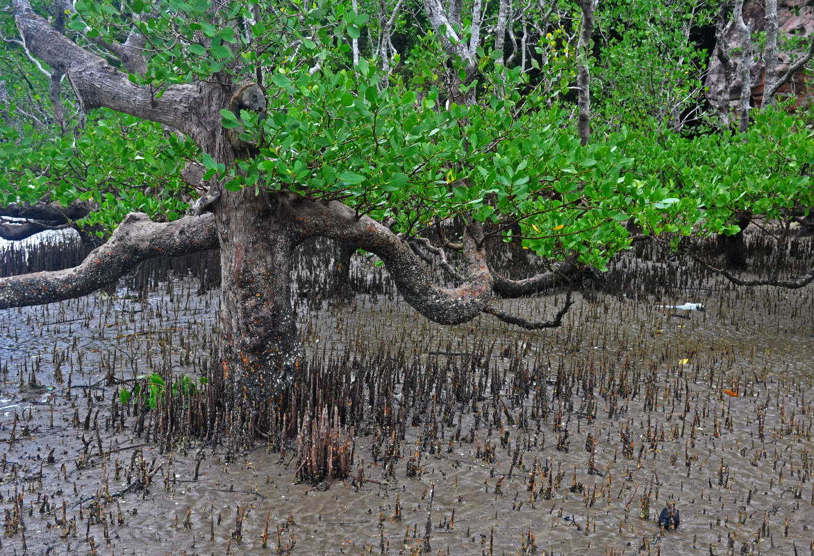 아래에 있는 첫 번째 사진은 오스트레일리아 '퀸즐랜드 주(State of Queensland)'에서 간조 때 촬영한 '리조포라 무크로나타(학명: Rhizophora mucronata)'이다. 물을 빨아들이고 있어서, 20m 정도인 줄기의 도중부터 낙지발 모양으로 뿌리가 생장하는 모습이 잘 보인다. 맹그로브 식물의 뿌리에는 여러 가지 모양이 있지만, 어떤 것이든 일부는 지하가 아니라 지상으로 나온다는 공통점이 잇다.