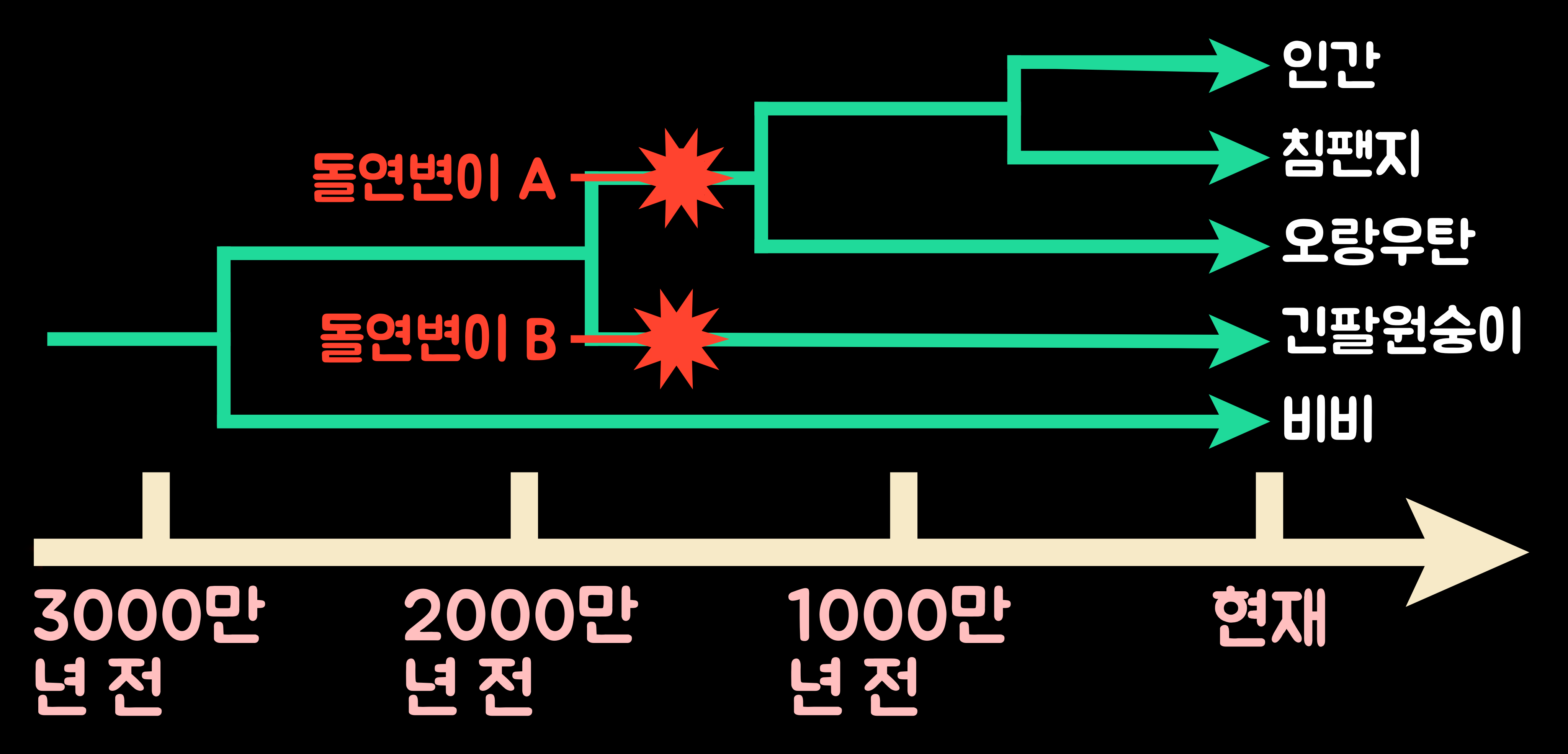 아래의 그림은 인간과 침팬지 등이 갈라지면서 진화해 온 과정과 '요산을 분해하는 효소'를 만드는 유전자에 돌연변이가 일어난 시기를 나타낸 것이다. 돌연변이 A와 돌연변이 B는 인간 등의 조상과 긴팔원숭이의 조상이 갈라진 이후에 각각 따로 일어났지만, 요산을 분해하는 효소의 유전자가 기능을 상실했다는 같은 결과를 낳았다.