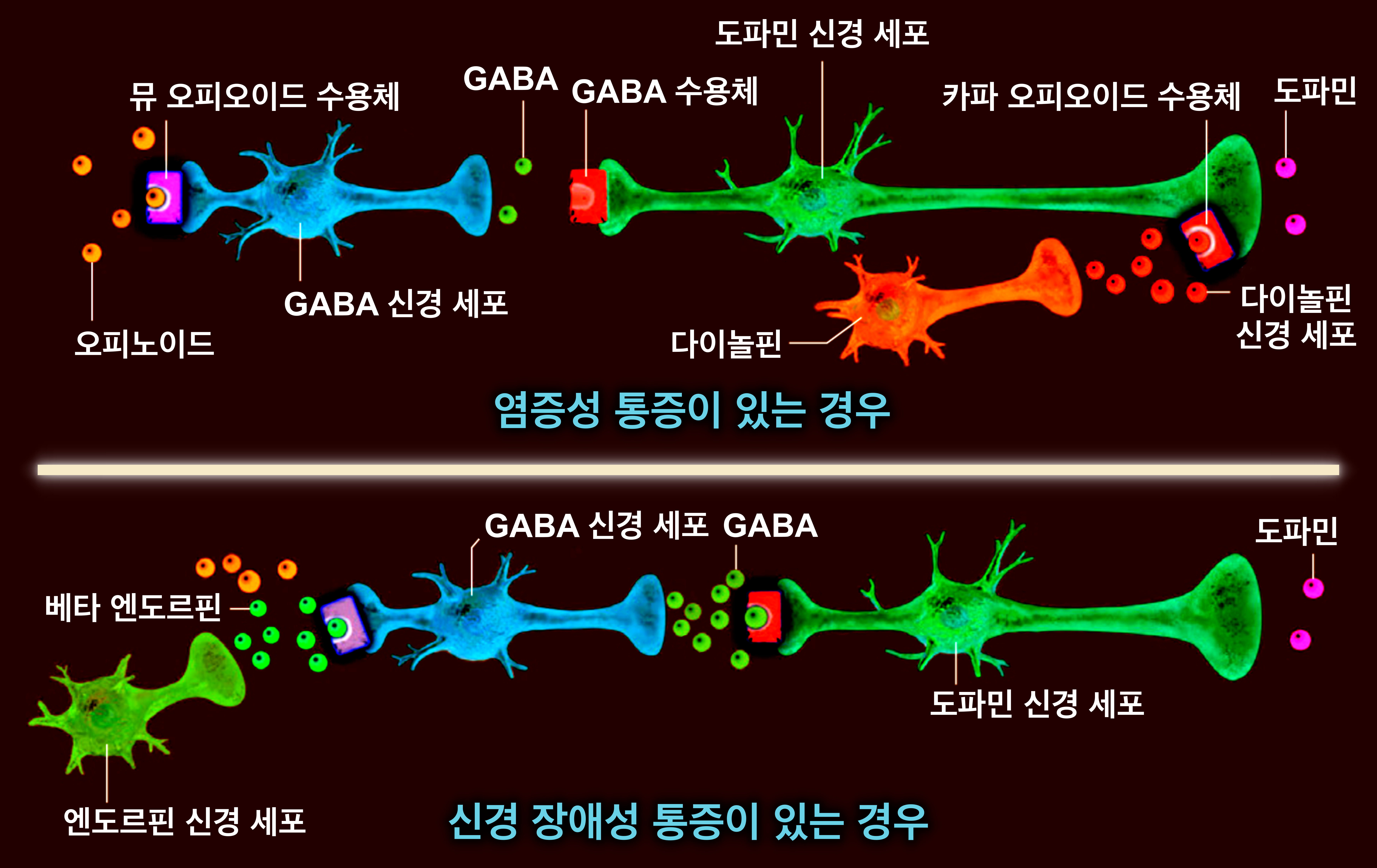 - '신경 장애성 만성 동통'이 있는 경우: '신경 장애성 만성 동통'이 있는 경우에는 '베타 엔도르핀'이 지속적으로 분비되어 'GABA 신경 세포'의 '뮤 오피오이드 수용체'가 과잉 활성화된 상태에 있다. 그렇지만 이 상태가 계속되면 '뮤 오피오이드 수용체'의 기능이 낮아지는 것으로 알려져 있다. 그러면 GABA 신경 세포의 작용이 억제되지 않아 도파민의 방출이 방해된다. 따라서 도파민이 과다 분비되지 않아 의존증이 생기지 않는다.