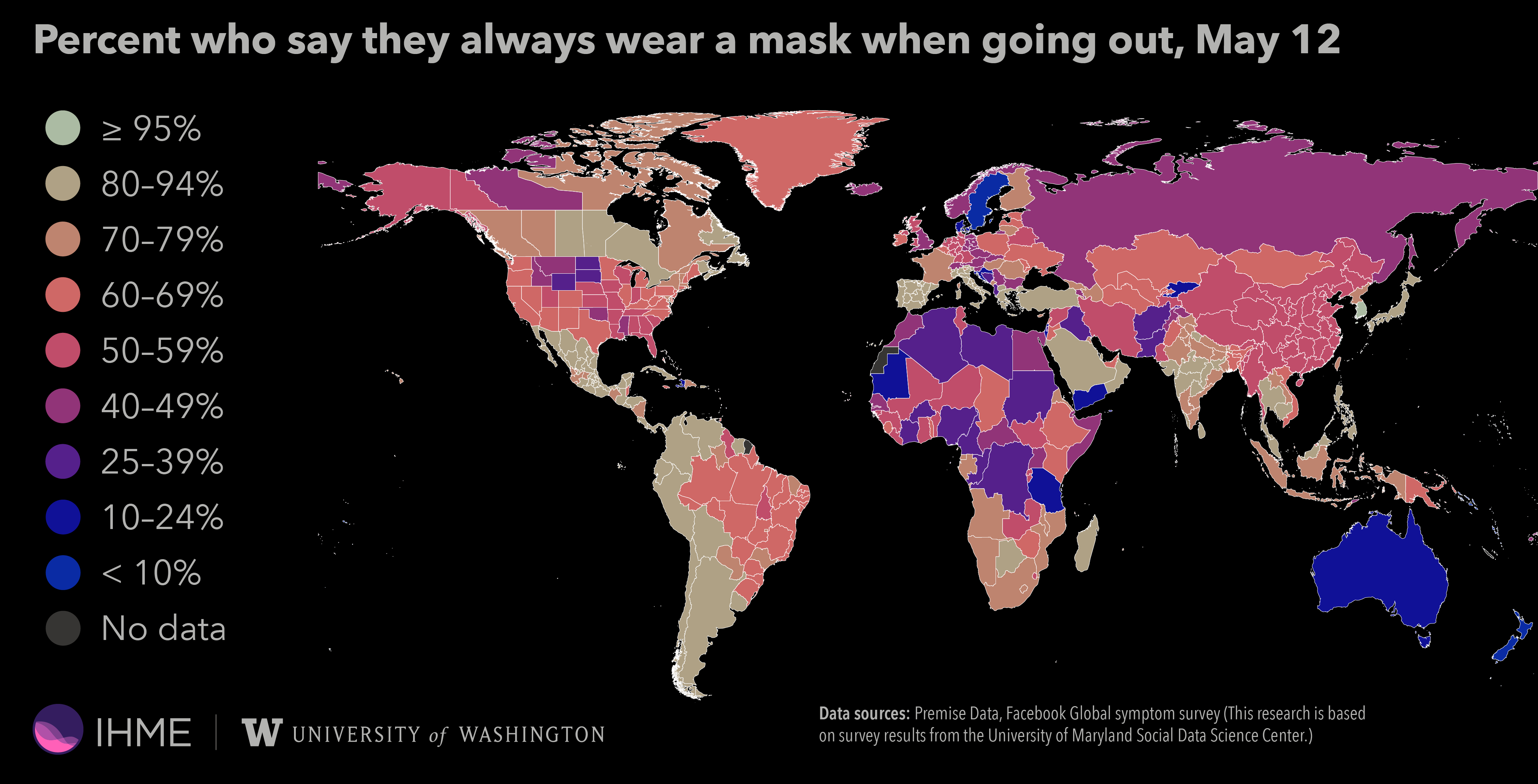 아래의 그림은 '코로나바이러스-19(COVID-19)'가 확산되었을 당시, '외출 시 항상 마스크를 착용한다고 응답한 비율'을 '분포 시각화' 형태로 분석한 지도이다. '외출 시 항상 마스크를 착용한다고 응답한 비율'이 95%를 넘는 나라는 한국이 유일했음을 알 수 있다.