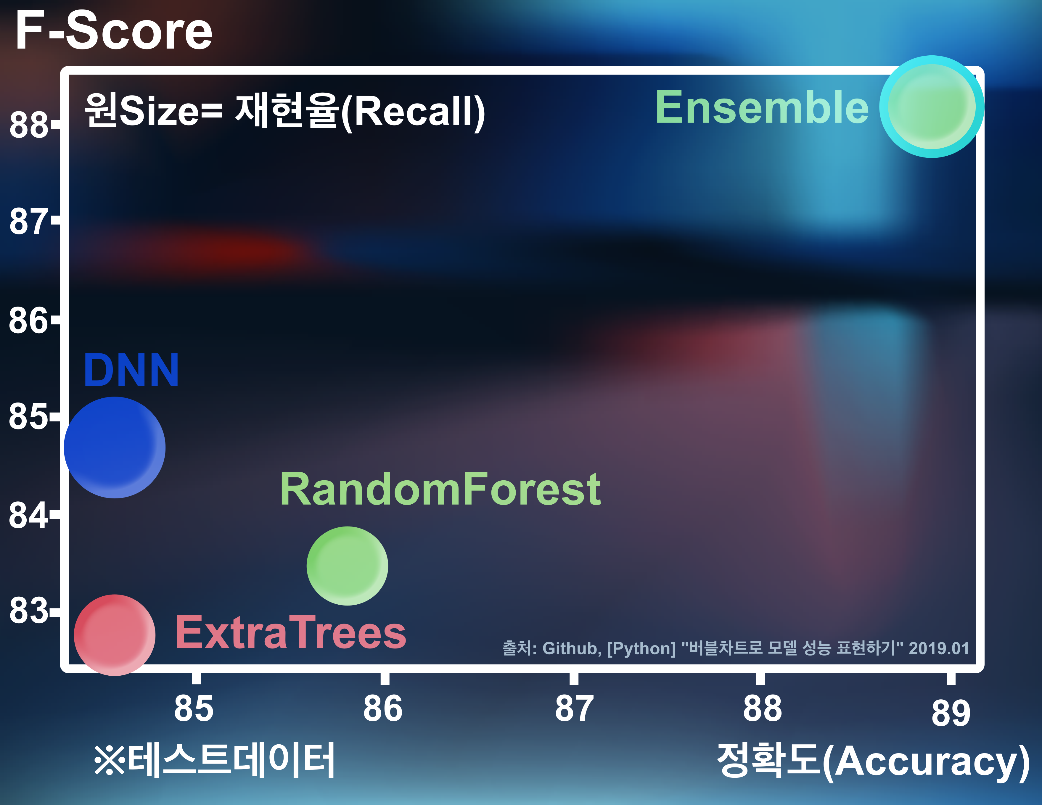 아래의 그림은 '인공 신경망' 모델들의 성능을 '버블 차트(Bubble Chart)'로 나타낸 것이다. 가로축은 정확도, 세로축은 F1-Score로 구현하여 모델 각각에 대한 성능을 나타내며, 버블의 크기로 '재현율(Recall)'을 표시하고 있다. 해당 버블 차트를 통해 '신경망 모델들의 전체적인 정확도' 및 'F1-Score 추이'를 알 수 있으며, 특정 신경망 모델의 성능이 다른 모델들에 비해 압도적으로 높은 것을 한눈에 확인할 수 있다. 즉, 사용자들은 '버블 차트'를 통해 신경망 모델들의 성능 추이 및 모델들 각각의 개별 성능을 한눈에 비교할 수 있다.
