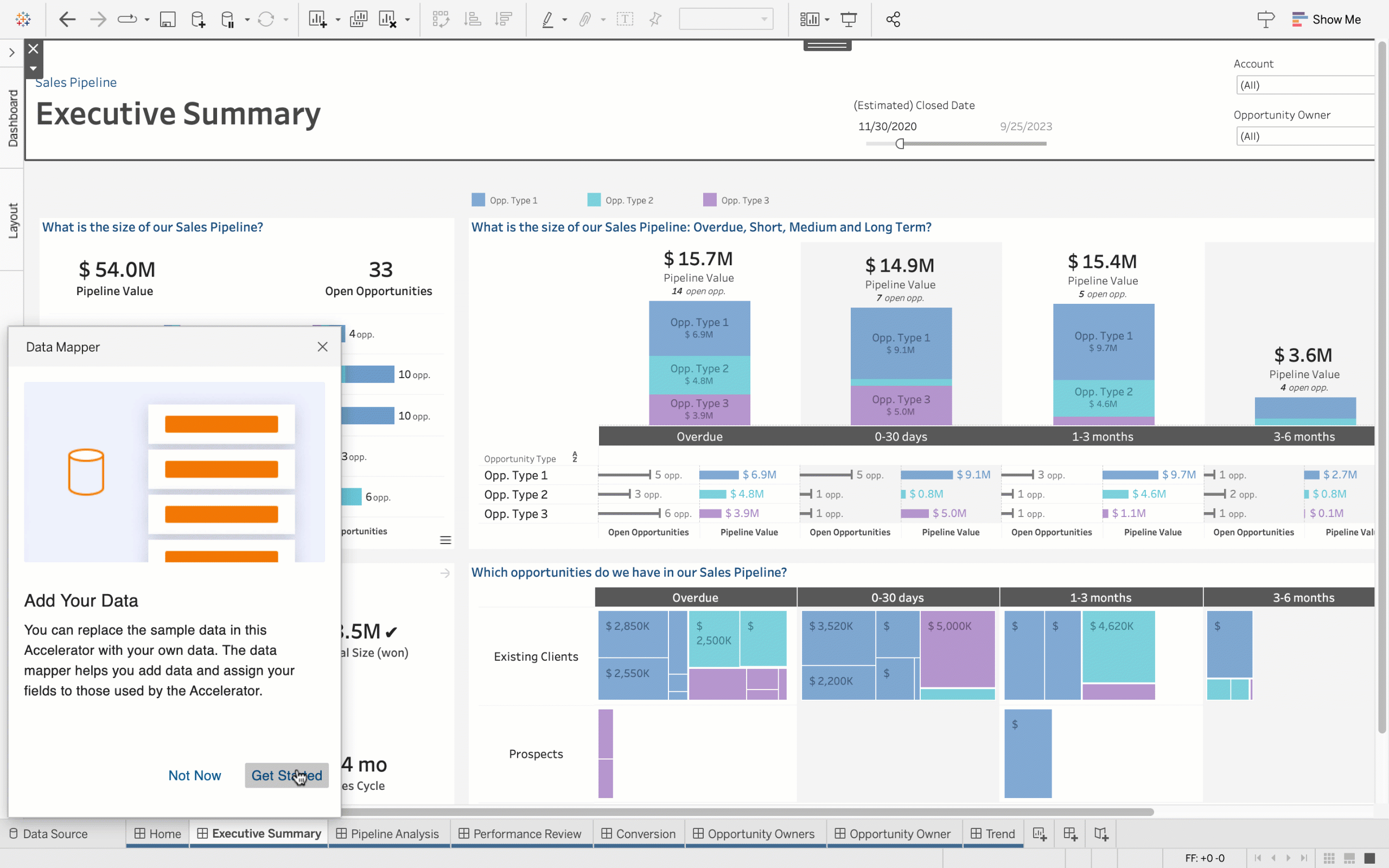 '세일즈포스(Salesforce)'의 '태블로(Tableau)'는 간단한 조작만으로 데이터를 분석하고 시각화된 자료를 공유할 수 있도록 한 솔루션이다. '태블로 소프트웨어(Tableau Software)'는 2003년 후발 주자로 '비즈니스 인텔리전스(BI: Buisiness Intelligence)' 시장에 뛰어들어, 기존 BI 산업의 강자였던 SAP를 제치고 세계 BI 솔루션 시장에서 1위를 차지하였다. '태블로 소프트웨어'는 이후 2019년도에 세일즈포스에 인수되어, 세일즈포스 사에서 '태블로 솔루션' 판매를 담당하고 있다. '태블로'는 간편한 시각화 과정을 내세워 전 세계 사용자들의 선택을 받고 있다. R에서 시각화를 하려면 코드를 입력하고, '데이터 임포트(Data Import)', '라이브러리 가동', '축의 변수명 지정' 등 번거로운 절차를 거쳐야 했던 것과 달리, 태블로에서는 간단히 '드래그 앤 드롭(Drag & Drop)'을 통해 데이터 시각화를 수행할 수 있다. '태블로 솔루션'은 국내에 2014년도에 런칭되어, 2019년 상반기 기준 1000여 개 이상의 고객을 확보하였다.