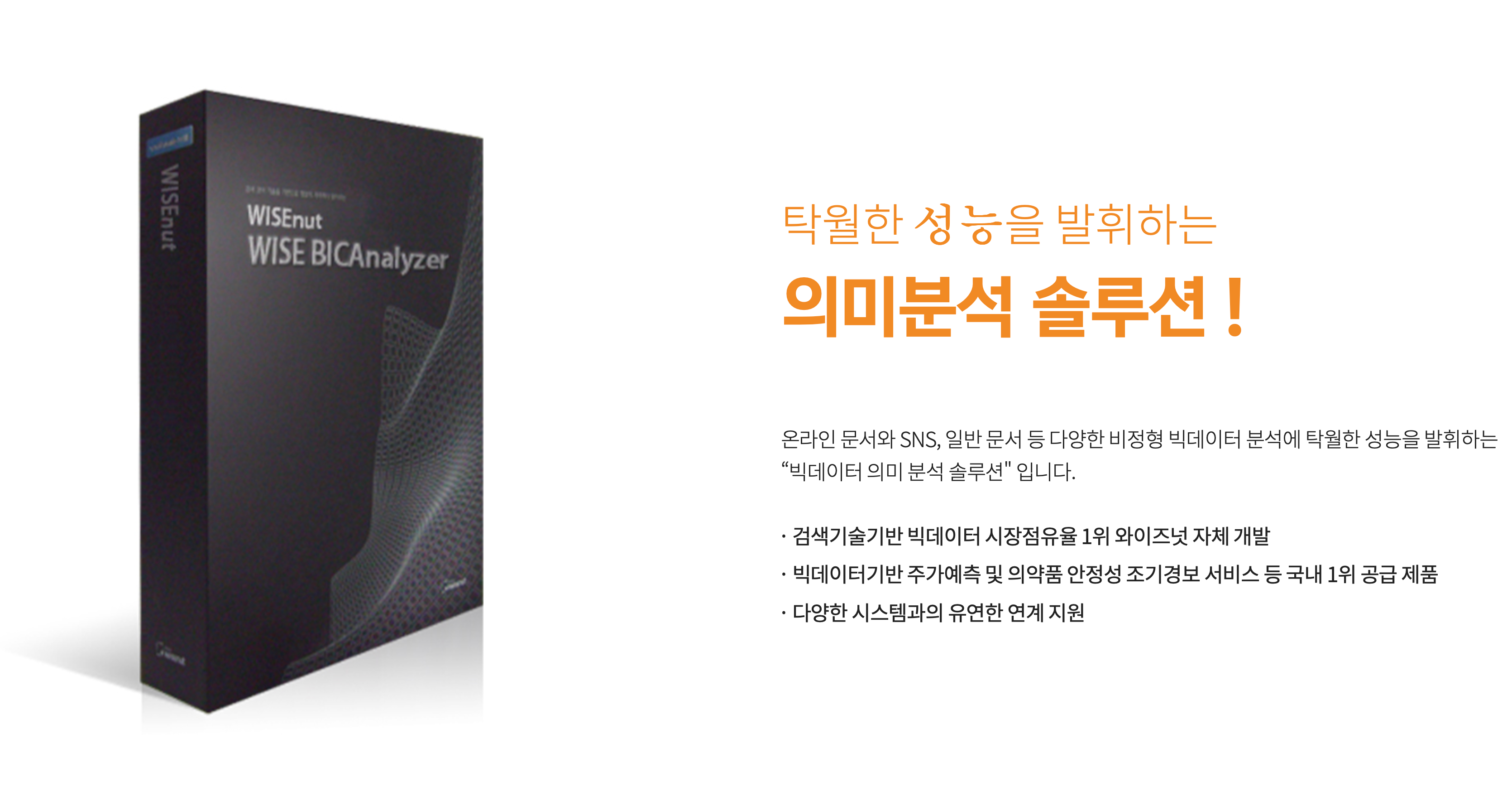 '와이즈넛(WISEnut)'은 2000년도에 설립된 '인공지능 기반 챗봇', '빅데이터 수집', '분석 솔루션' 전문 기업으로, 빅데이터 의미분석 솔루션을 제공하고 있다. '와이즈넛'의 WISE BIC Analyzer는 비정형 빅데이터의 의미를 분석하고 빠른 의사결정을 지원하는 솔루션이다. 해당 솔루션은 '텍스트 마이닝(Text Mining)' 및 '분류 기술'을 기반으로 구현되었다. WISE BIC Analyzer는 '형태소 분석', '자연어 처리', '표현어 추출' 기술을 포함하는 감성 분석용 언어 처리를 통해 감성 분석 결과를 지수화하고, 긍정 또는 부정 트렌드를 분석하며, 이슈나 급상승 키워드를 분석하여 제공하고 있다.