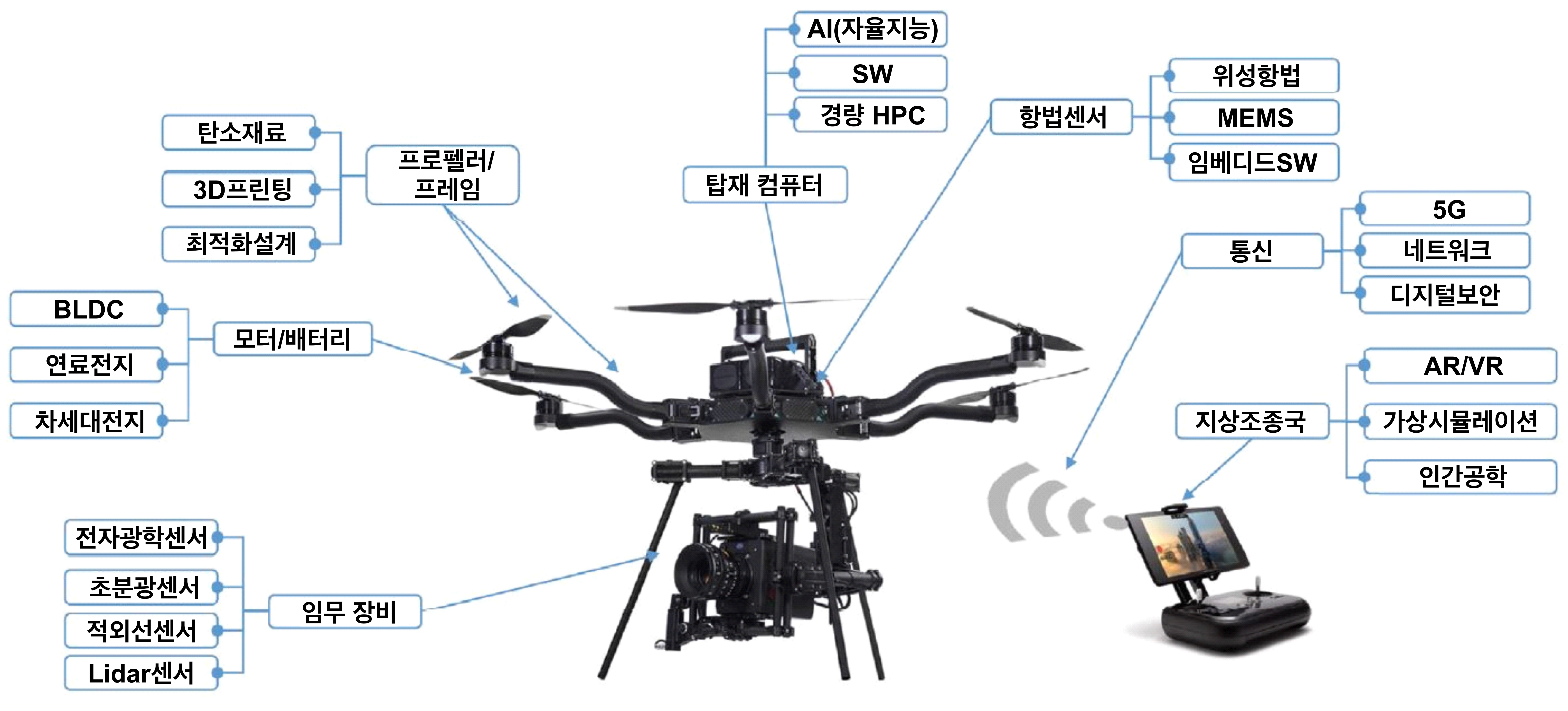 - 드론의 후방 산업: 인공지능, 가상현실, 증강현실, 연료전지, 5G 통신, 탄소섬유 등