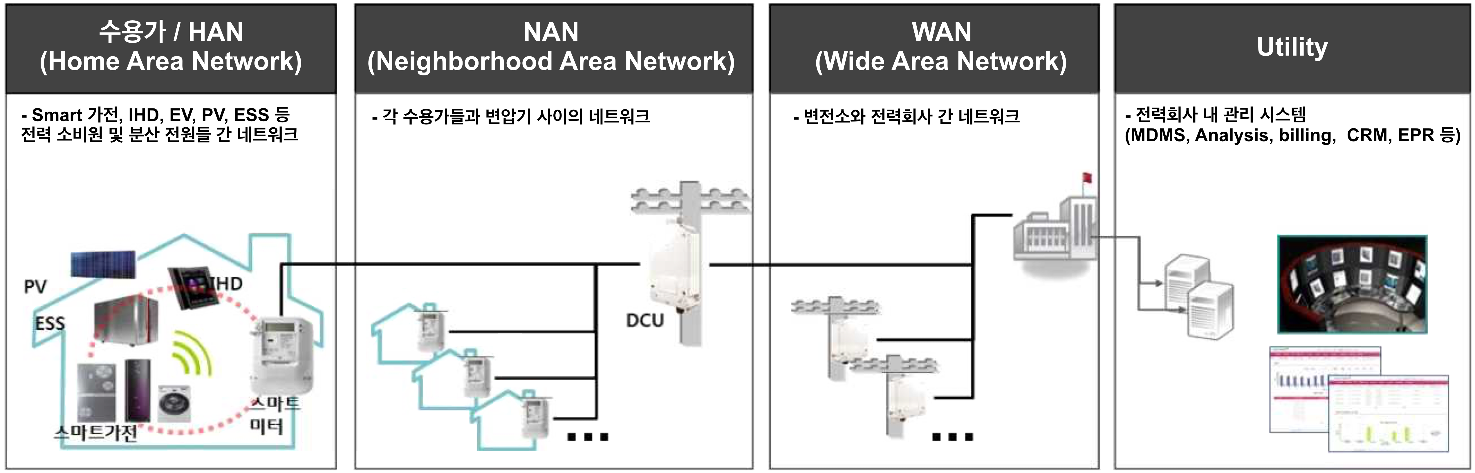 '데이터 집중 장치(DCU)'는 'WAN(Wide Area Network)'을 통하여 유틸리티 영역과 연계하고, 'NAN(Neighborhood Area Network)'을 통하여 'HAN(Home Area Network)' 영역의 스마트미터, 유틸리티 연계 장치와 통신함으로서, 유틸리티 영역과 HAN 영역을 연계하여 에너지 사용자의 '에너지 사용 정보', '정전 정보', '수요반응 정보' 등을 전송한다.