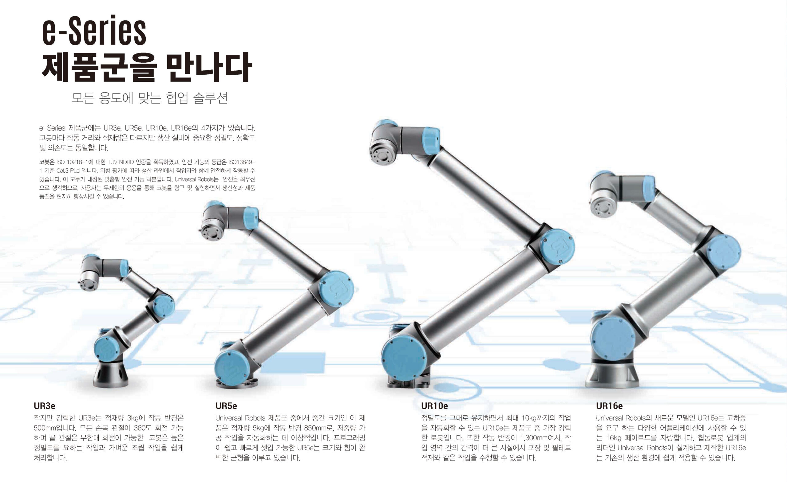 2008년에 첫 모델인 'UR5'를 출시한 이후, 꾸준히 제품 라인업을 확장하고 있다. 2018년에는 고객들이 협동 로봇이 사용하며 느꼈던 불편함을 개선하기 위해 '센서', '안전성', '정밀도', '편리성' 등을 높인 'e-series'를 출시하였다.