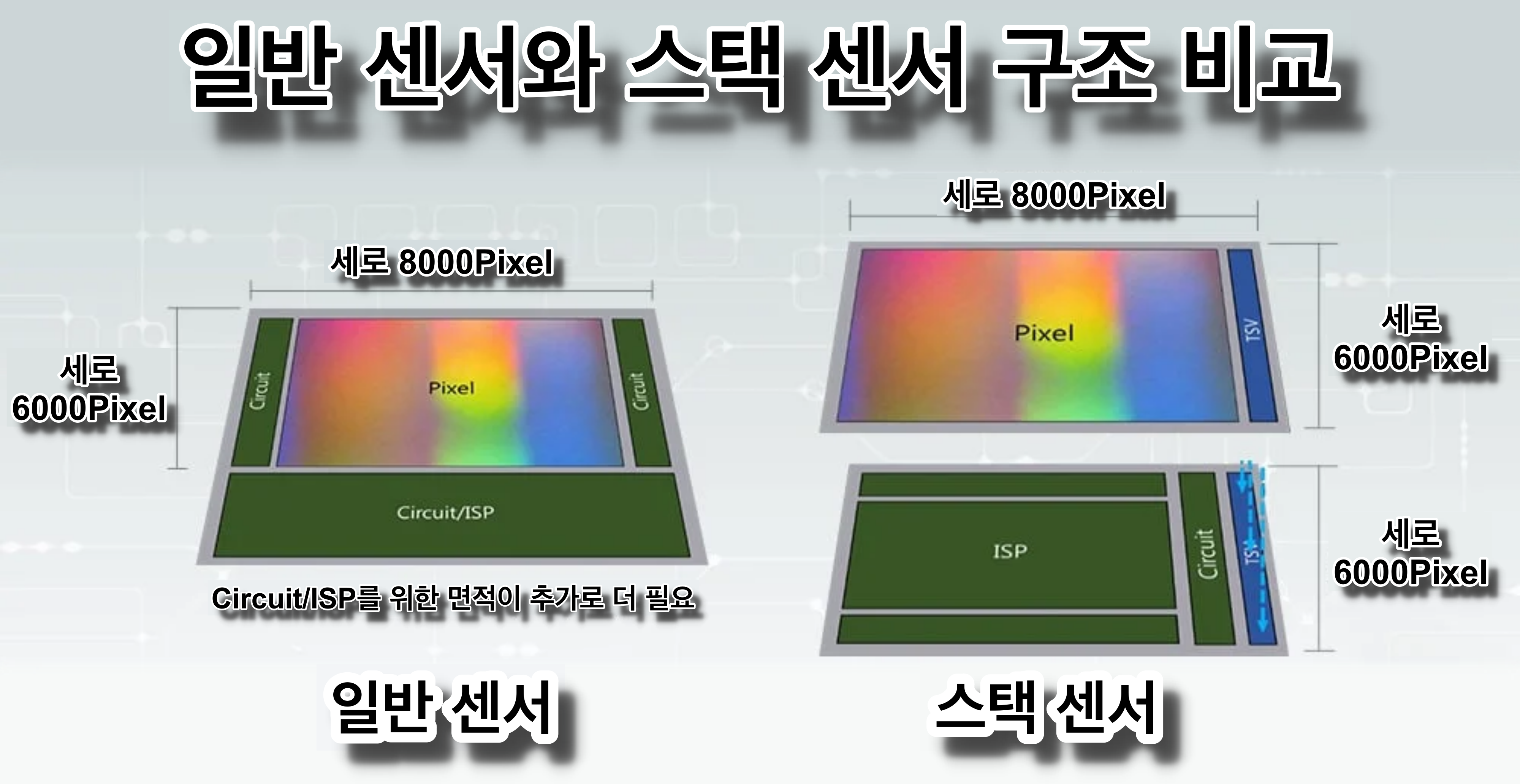 '화소(Pixel)'와 '회로(Circuit)'가 포개어져 상판 화소가 차지하는 면적만큼 하판 회로를 사용할 수 있어, 그만큼 활용할 수 있는 면적이 넓어지게 되었다. 또한 '스택 센서(Stack Sensor)'는 상판 화소와 하판 회로에 독립적인 공정을 적용할 수 있다는 장점을 갖고 있다. '하판 회로'에 '상판 화소 공정' 대신 '초미세 로직 공정'을 적용하면, 복잡한 '이미지 신호 처리(ISP: Image Signal Processing)' 알고리즘도 저전력·고집적 디지털 회로로 구현할 수 있다. '재래식 센서'의 '이미지 신호 처리(ISP)'는 회로 면적 제한으로 인해 '렌즈 보정', '결함 보정'과 같은 단순 기능만을 지원했지만, '스택 센서'의 ISP는 '초미세 로직 공정'을 활용해 '영상 처리(Image Processing)', '컴퓨터 비전(Computer Vision)', '인공지능(AI)'과 같은 혁신적인 알고리즘을 구현할 수 있게 되었다.