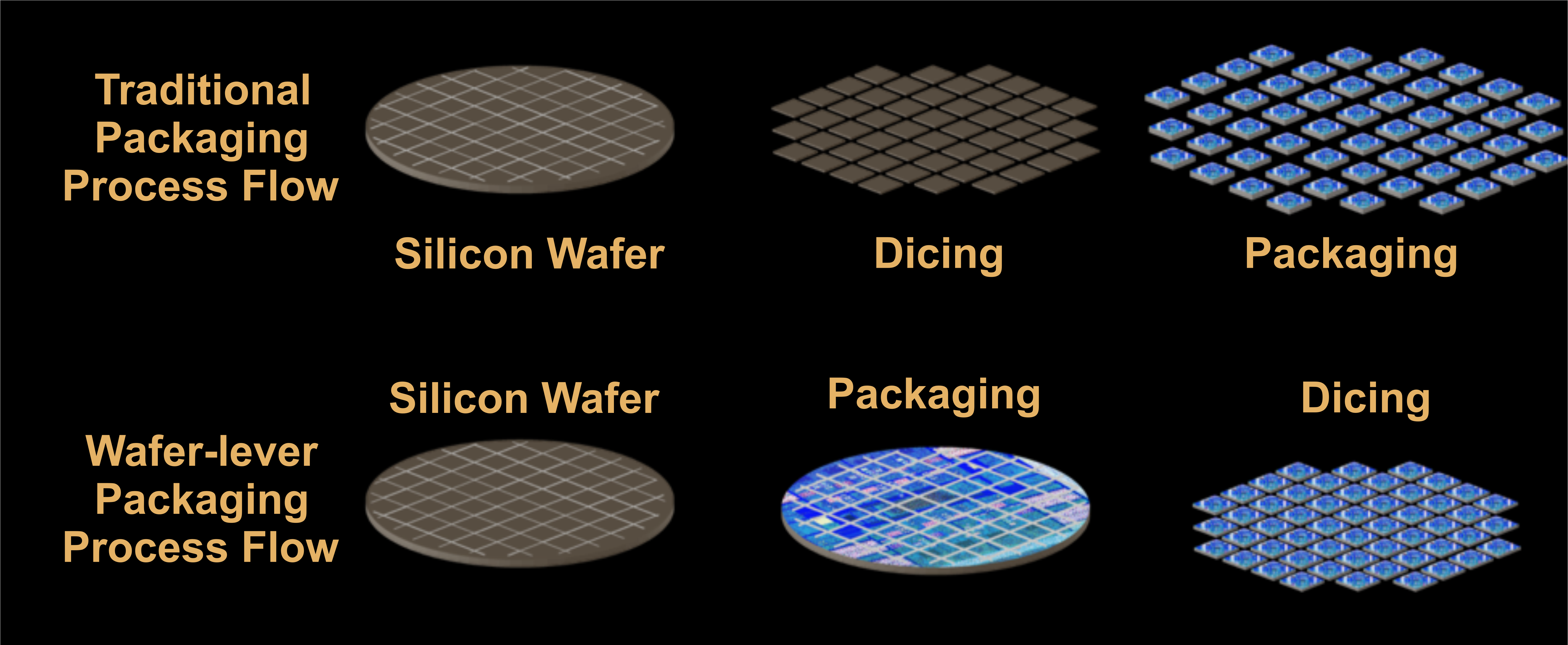 '웨이퍼 레벨 패키징(WLP: Wafer Level Packaging)'는 패키징과 전기적 테스트 등 필요에 따라 Burn-in까지 웨이퍼 상태에서 진행한 후에 마지막으로 개개의 패키지로 분리하는 공정 방법을 말한다. 가장 큰 차이점은 '패키징(Packaging)'와 '다이싱(Dicing)' 공정이 서로 바뀌어서 진행된다는 점이다. IC 칩 크기와 동일한 크기의 패키지 형태인 'WLCSP(Wafer Level Chip Scale Packaging)'는 기판 등의 '인터포저(Interposer)'를 사용하지 않고 WLP 공정을 사용한다는 점에서 전통적인 'CSP(Chip Scale Packaging)'와는 다르다.