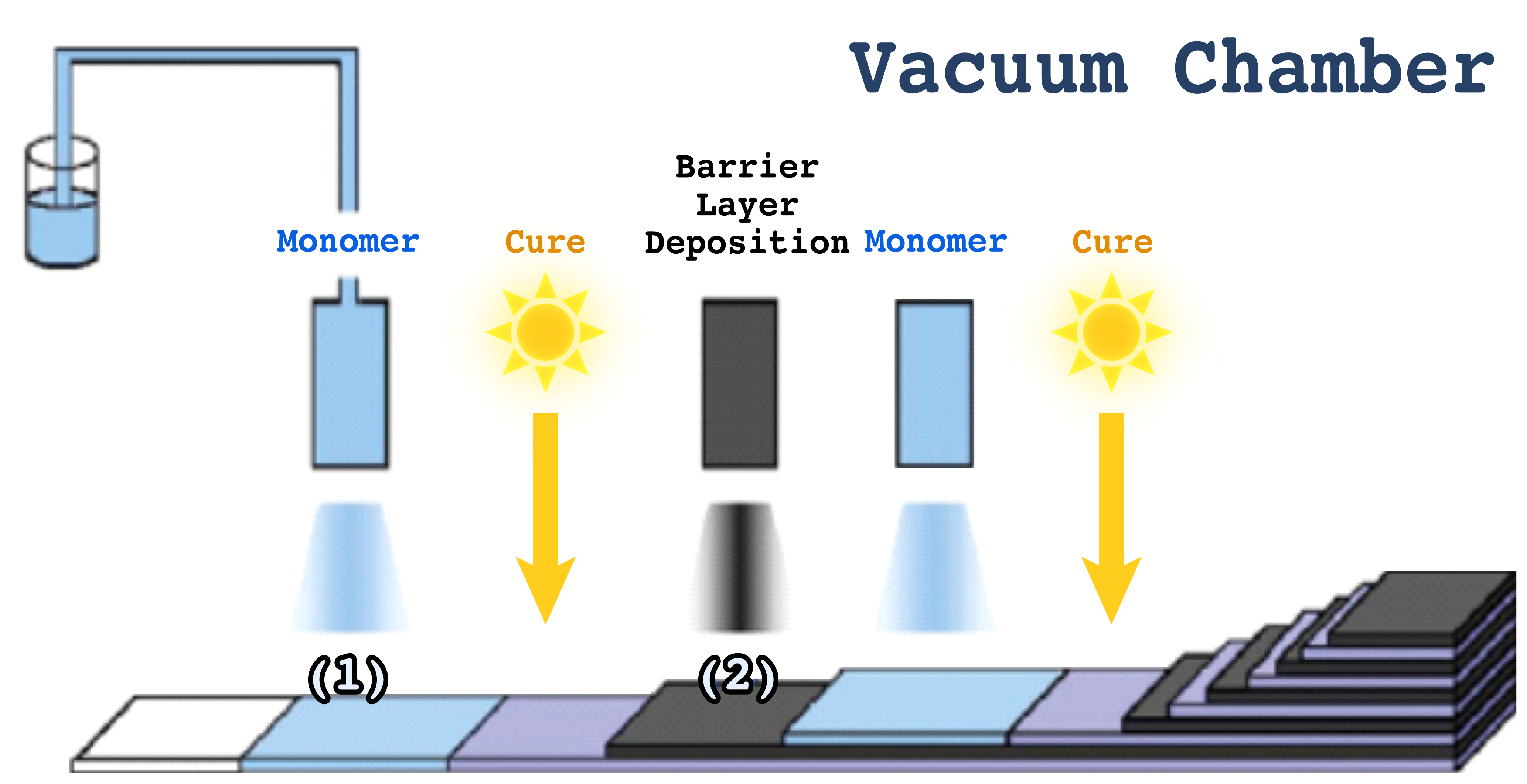 '플렉시블 OLED' 구동 방식의 '유기 발광층(Organic Luminous Layer)'의 빛을 내는 '유기물질(Organic Matter)'과 '전극(Electrode)'은 산소와 수분에 민감하여 발광 특성을 잃는다. 때문에 이를 차단하여 수분의 침투를 막아주는 '봉지층(Encapsulation)' 형성이 필요하다. 플렉시블 디스플레이에서는 유연성을 확보하면서 수분 침투 방지 성능을 향상시킨 'TFE(Thin Film Encapusulation)' 기술이 사용된다. 'TFE(Thin Film Encapusulation)' 기술은 유연한 유기물층과 투습 방지 성능이 뛰어난 무기물층을 교대로 적층시켜, 유연하면서도 수분 침투 방지에 효과적인 봉지층을 형성하는 기술이다. 'TFE(Thin Film Encapusulation)'는 ['무기물 증착(Sputtering)' → '유기물 도포(Organic Application)' → '경화(Hardening)'] 공정을 반복 수행하는 방식으로 다층 '배리어(Barrier)' 막을 형성시킨다.