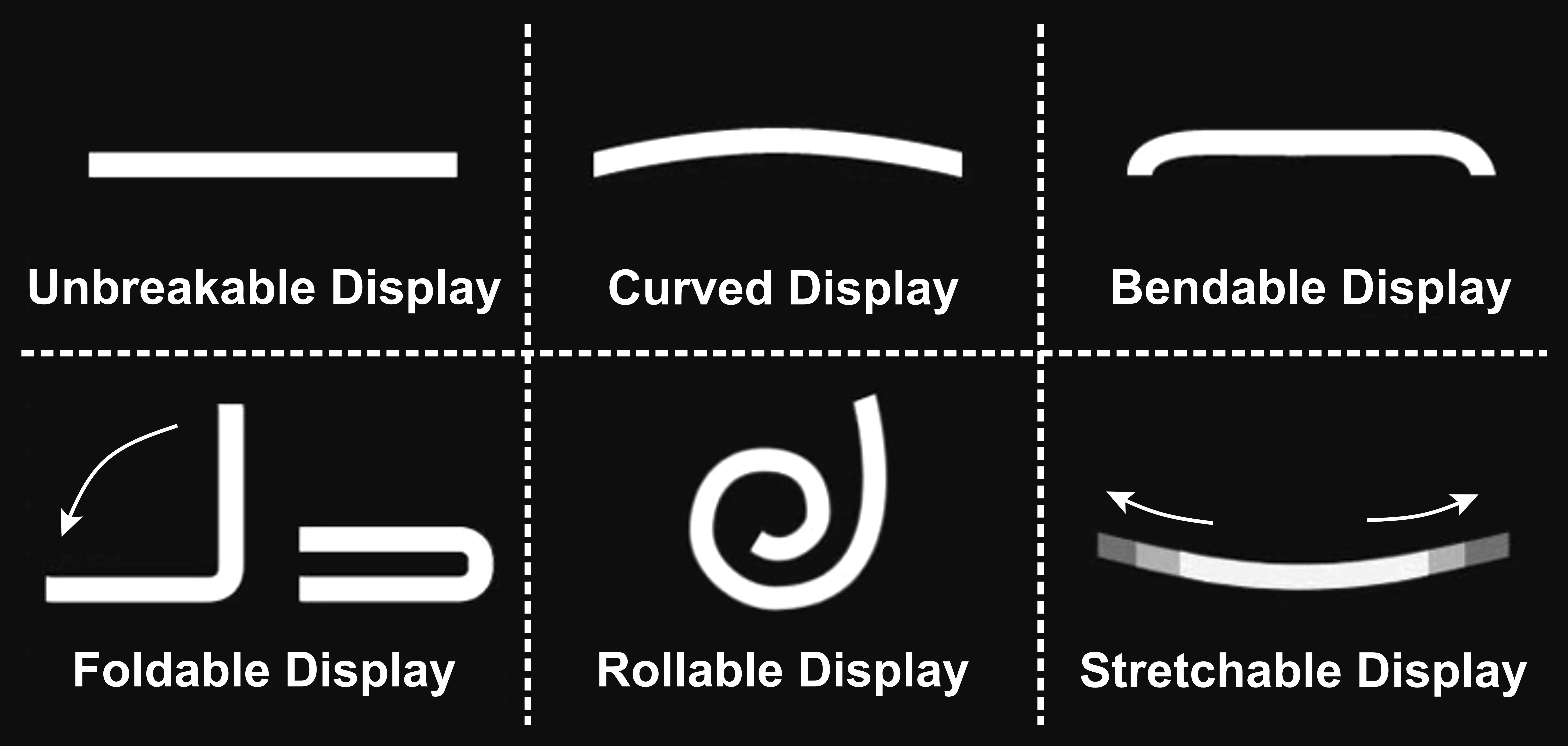 '플렉시블 디스플레이(Flexible Display)'는 휘는 정도에 따라 '곡선에 생키는 '커브드 디스플레이(Curved Display)', 휘어지는 '벤더블 디스플레이(Bendable Display)', 구부려지는 '폴더블 디스플레이(Folderble Display)', 말리는 '롤러블 디스플레이(Rollarble Display)', 늘릴 수 있는 '스트레처블 디스플레이(Stretchable Display)' 단계로 발전하고 있다.