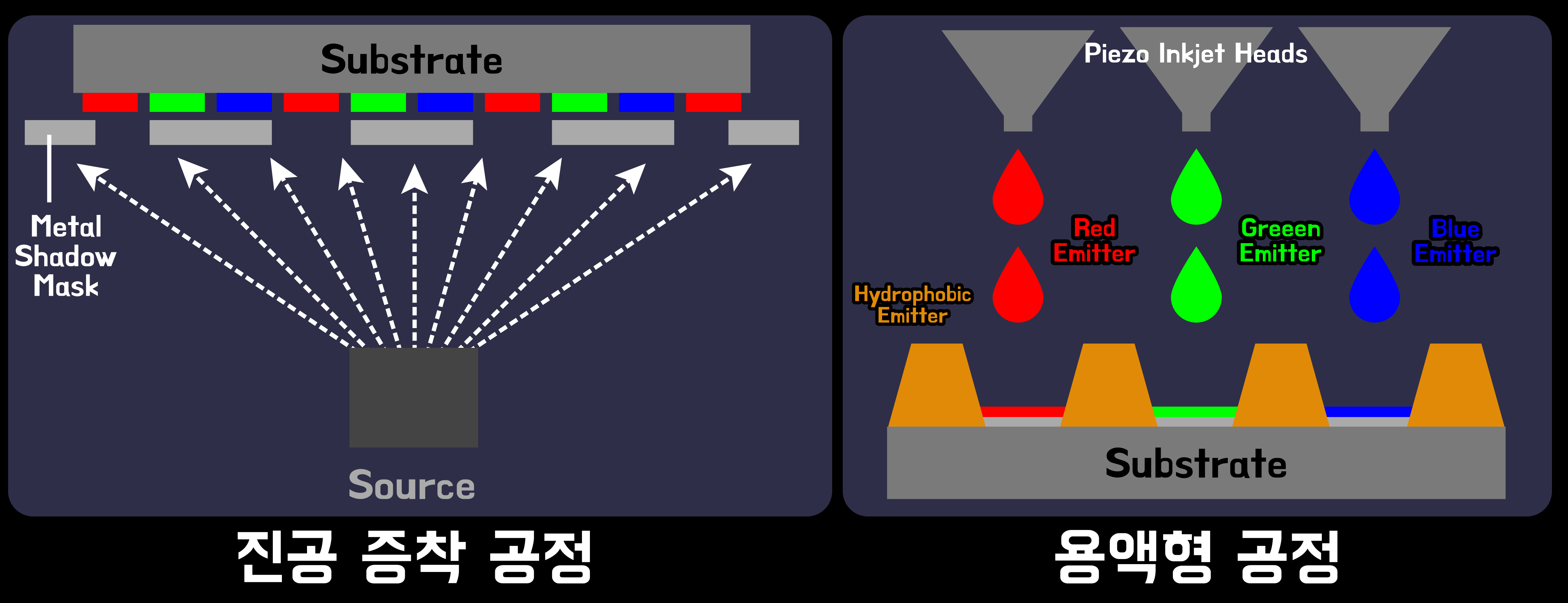 - OLED: 플렉시블 OLED는 'RGB 발광 방식' 그리고 빛이 기판의 정면을 통해 발산하는 '전면 발광(Top Emission)' 구조가 '삼성 디스플레이'와 'LG 디스플레이'에 동일하게 사용되고 있다. OLED 발광 방식에는 'RGB' 방식과 'WRGB' 방식이 있다. 'RGB' 방식은 Red, Green, Blue 각각의 유기 발광물질이 수평으로 도포되어 색상을 나타내는 방식이다. 한편 'WRGB' 방식은 유기 발광물질을 수직 적층하여 White 빛을 만든 후, TFT Backplane의 RGB 컬러필터를 통해 색상을 나타내는 방식이다. '삼성 디스플레이'는 RGB 방식으로 OLED 디스플레이를, LG 디스플레이는 WRGB 방식의 OLED TV를 양산하였다.