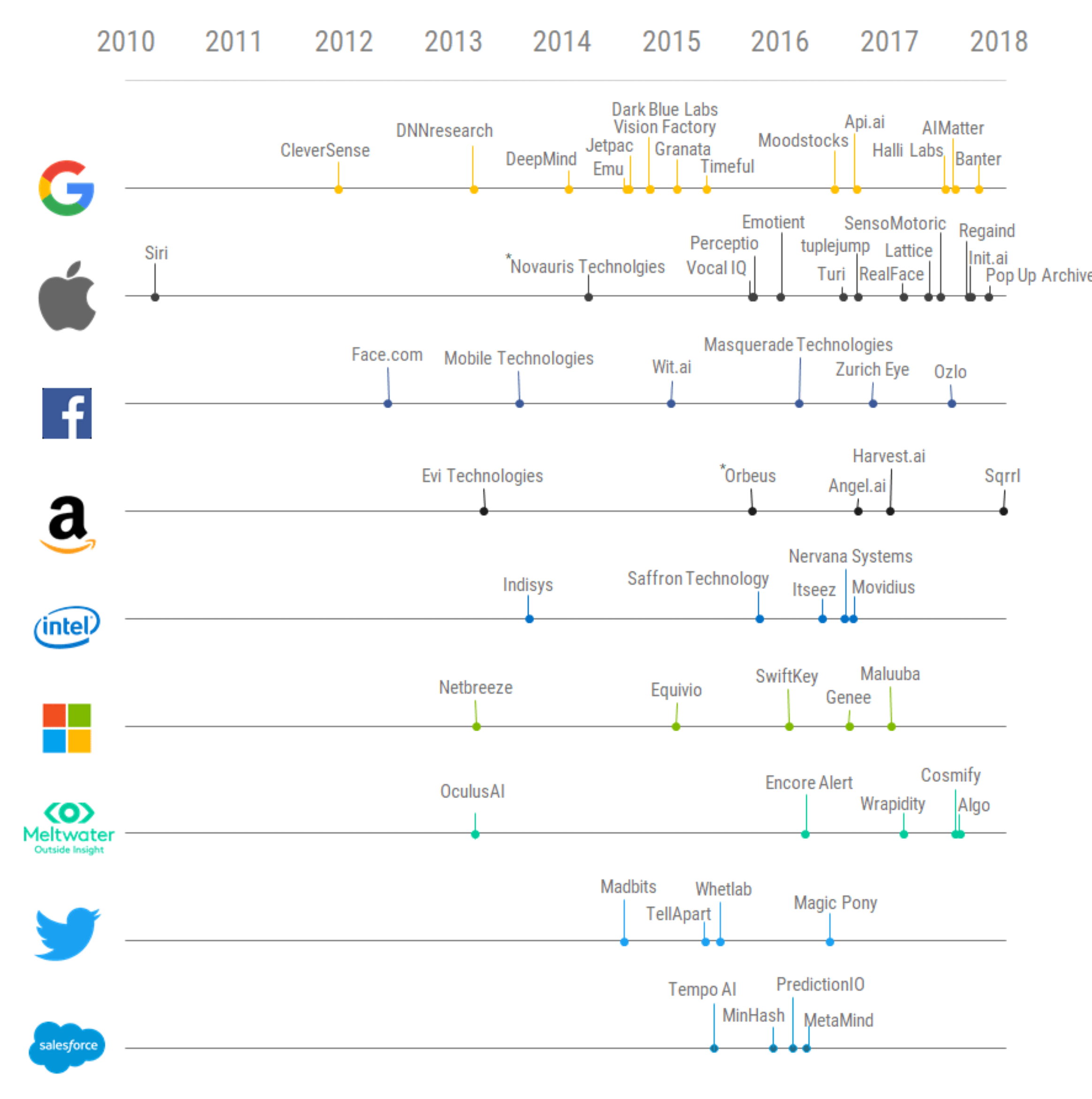 소매업에서 농업에 이르기까지 모든 산업 분야의 대기업들이 인공지능을 제품에 통합하려고 하고 있다. 하지만 인공지능 관련 개발자 및 인프라가 부족한 상황이다. 이로 인해 '구글(Google)', '애플(Apple)', '메타(Meta)' 등의 주요 해외 IT 업체들은 기술력과 인재 확보를 위해 전 세계 인공지능 스타트업을 적극적으로 인수하고 있다. 인공지능 분야 글로벌 스타트업의 수는 2018년 10월 기준, 약 5200개로 추정되며, 2018년 2월 기준 115개 스타트업이 '구글', '애플' 등 대기업에 인수된 것으로 조사되었다.