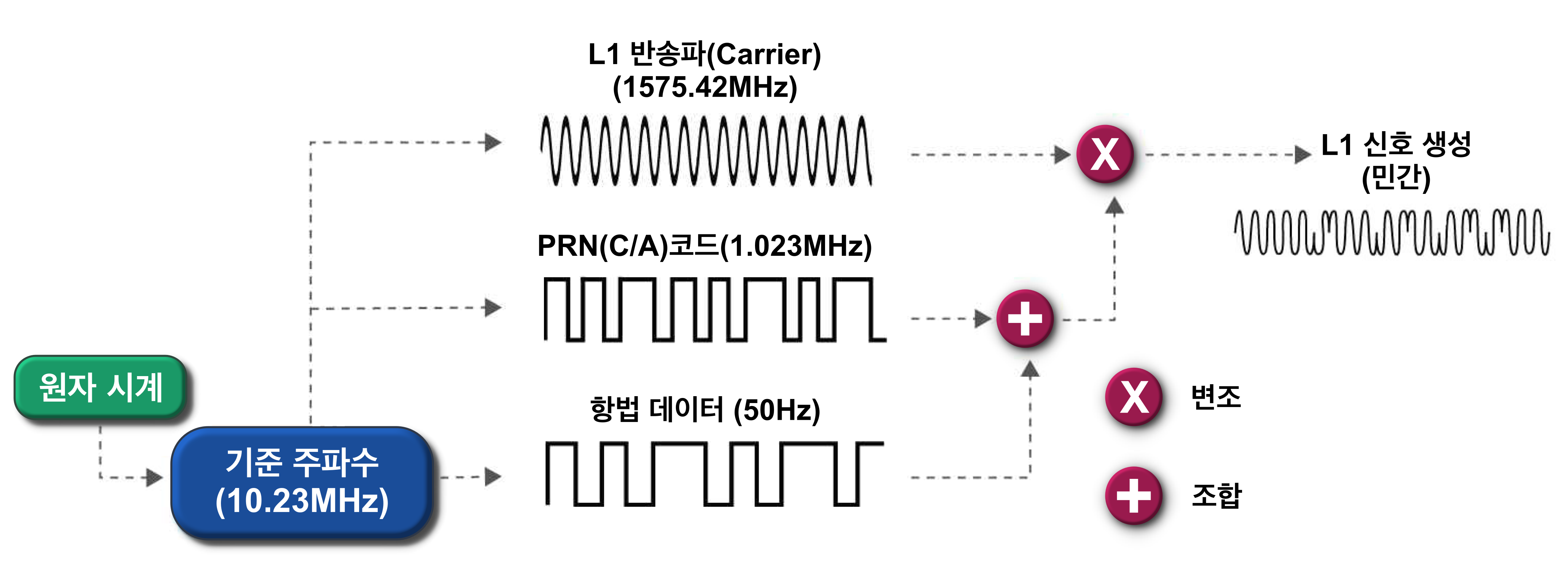 - '항법 데이터'와 'PRN 코드' 조합: 생성된 '항법 데이터'를 'PRN 코드'와 조합한다. 'PRN 코드(Pseudo Random Noise Code)'는 위성 식별과 거리 측정을 위해 생성되는 0과 1의 2진수이다. 국가마다 고유의 코드가 부여되며, 민간용 C/A와 군용 'P(Precise)'로 구분되어 지상의 '수신기(Receiver)'가 국가별 위성을 식별하고 목적에 맞게끔 활용할 수 있는 일종의 '키(Key)' 역할을 수행한다.