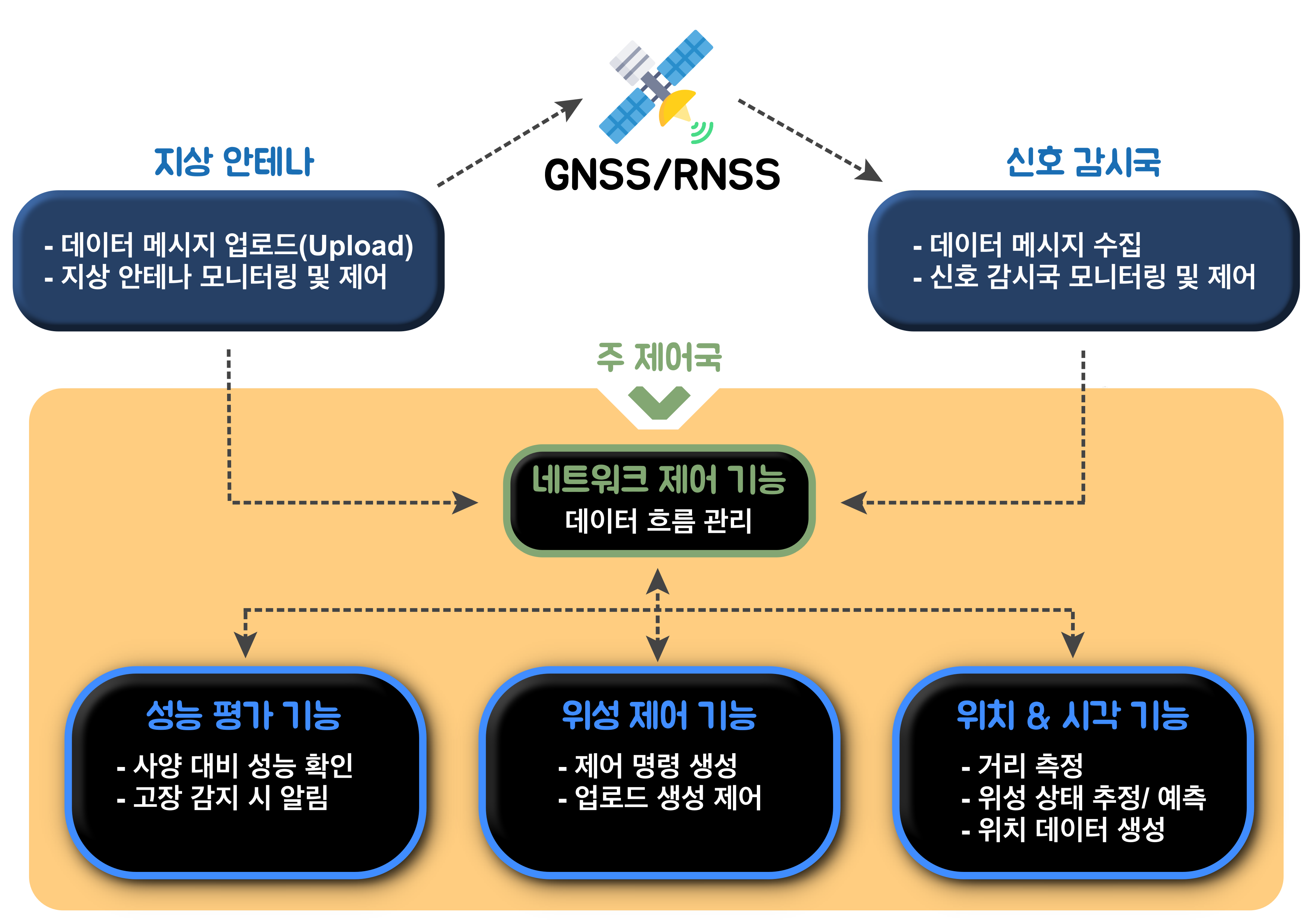 - '글로벌 위성 항법 시스템(GNSS: Global Navigation Satellite System)', '지역 위성 항법 시스템(RNSS: Regional Navigation Satellite System)' 신호를 기준국에서 수신하여 위성 신호 외에 들어오는 잡음을 제거한 순수한 위성 신호를 검출 후 중앙 처리국으로 전송한다.