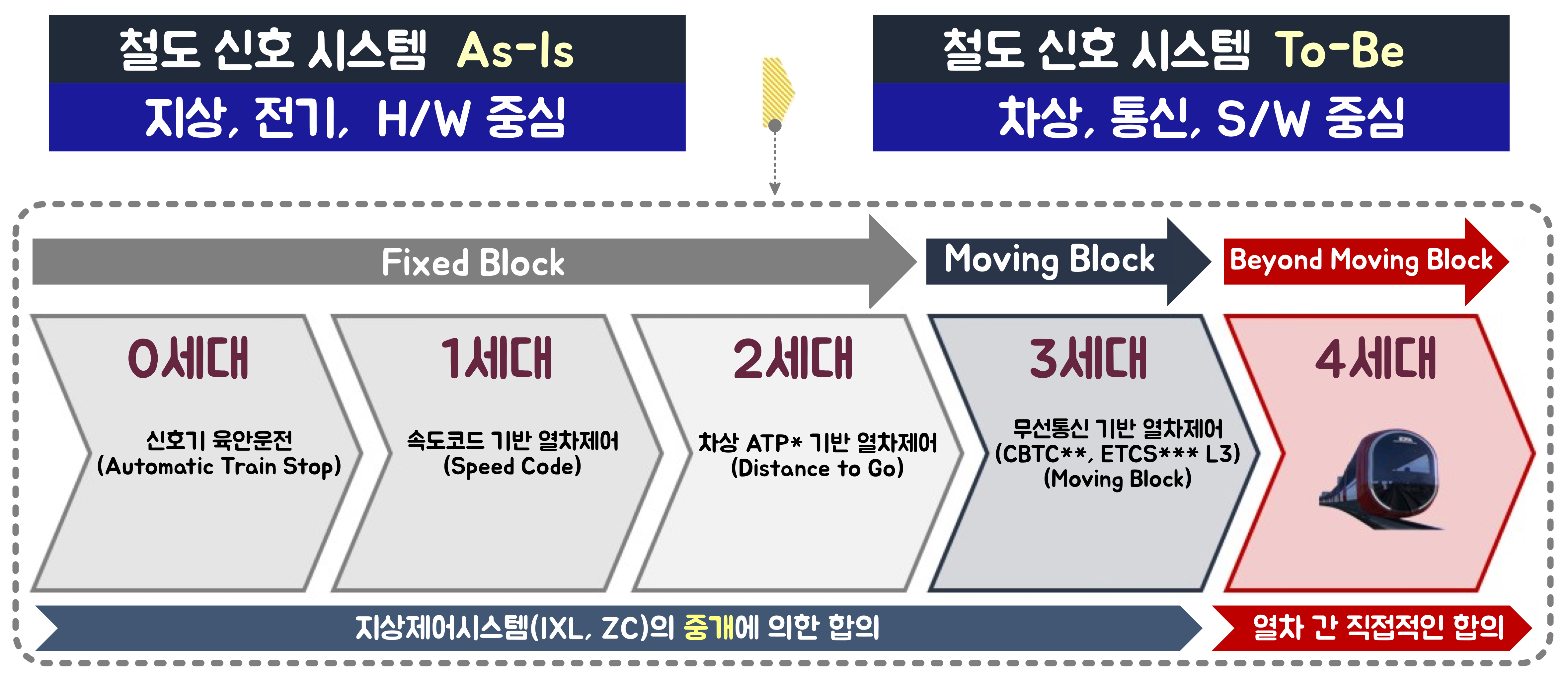 철도신호 기술은 '지상 설비 절감', '수송력 제고', '수송 유연성 확대'를 위해 과거 '지상', '전기', '하드웨어(H/W)' 중심에서 '차상(Vehicle)', '통신', '소프트웨어(S/W)' 중심으로 변화하고 있다.