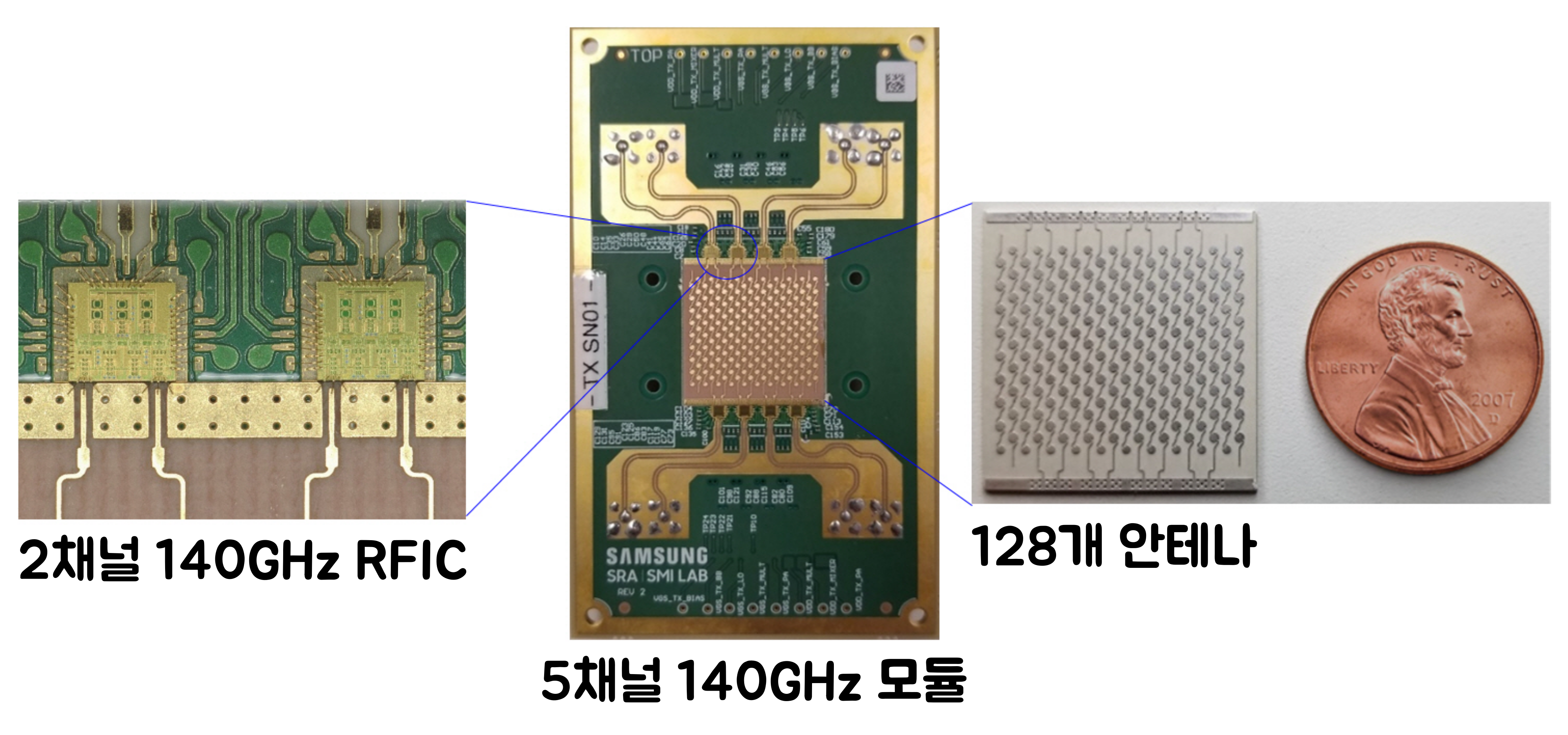 테라헤르츠 대역의 무선통신 시연을 위해서 CMOS 기반으로 제작된 '무선통신용 초고주파 칩(RFIC: Radio Frequency Integrated Circuit)', 128개 안테나가 다중 배열된 '위상배열 송수신기', '베이스밴드 모뎀' 등을 활용하여 테스트하였고, 실시간 무선통신할 수 있는 기술을 개발하였다. 테라헤르츠 대역의 무선통신 시연을 위해서 사용한 6채널 140GHz 모듈, 이를 구성하는 2채널 140GHz '무선통신용 초고주파 칩(RFIC)' 및 '128개 안테나'는 아래의 그림과 같다.