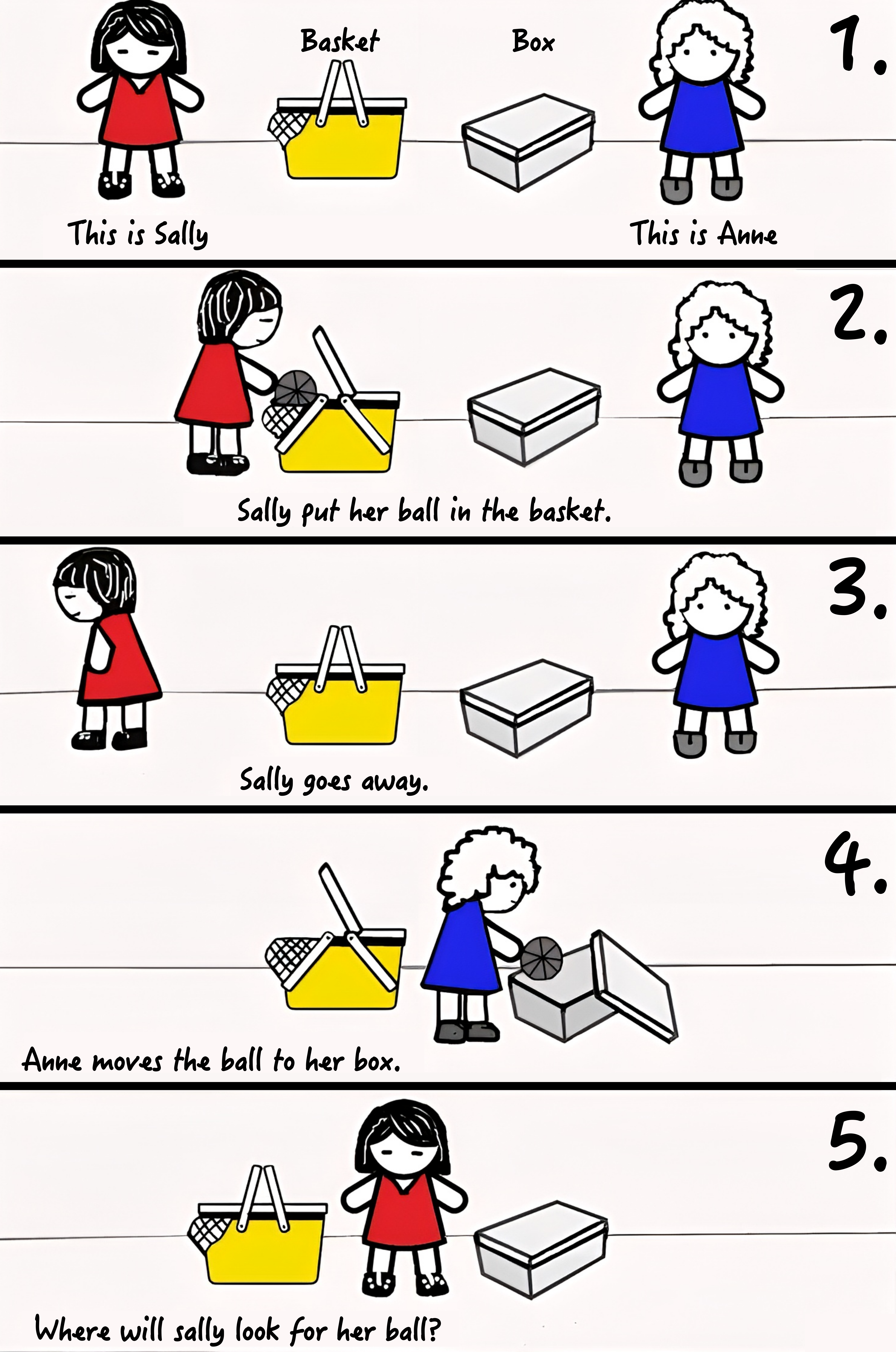 '샐리(Sally)'는 공이 '상자(Box)' 안에 들어 있다는 사실을 모르기 때문에 정답은 '바구니(Basket)'이다. 4세 어린이의 경우에는 이 문제의 정답률이 약 50%이지만, 5세 어린의 경우에는 이 문제의 정답률이 80%가 된다. '마음 이론(Theory of Mind)'은 보통 4~5세에 완성된다. 그러나 '자폐 범주성 장애(ASD)'인 사람은 '마음 이론'에 장애가 있기 때문에 틀리는 경우가 있다.