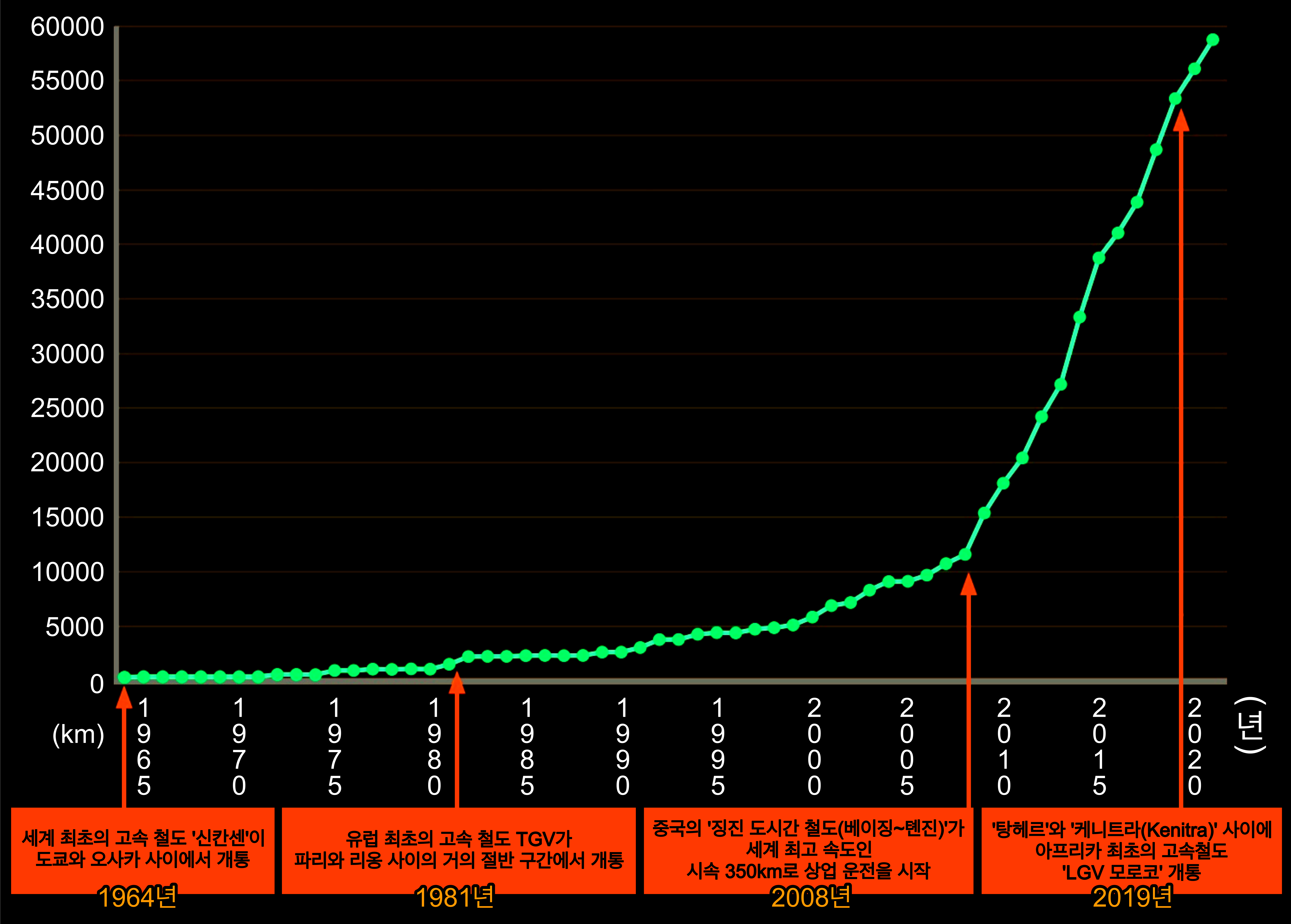아래의 그래프는 세계 고속 철도 총연장의 변화를 나타낸 것이다. 1964년의 일본 도카이도 신칸센이 개통한 해애 515km였던 총연장은 프랑스의 운행을 계기로 완만하게 늘어나기 시작하다가, 2007년 중국이 본격적인 고속 철도 운행을 시작하고 나서는 가파르게 상승했다. 2021년 기준, 총연장 5900km 가운데 70% 가까이가 중국의 노선이다.