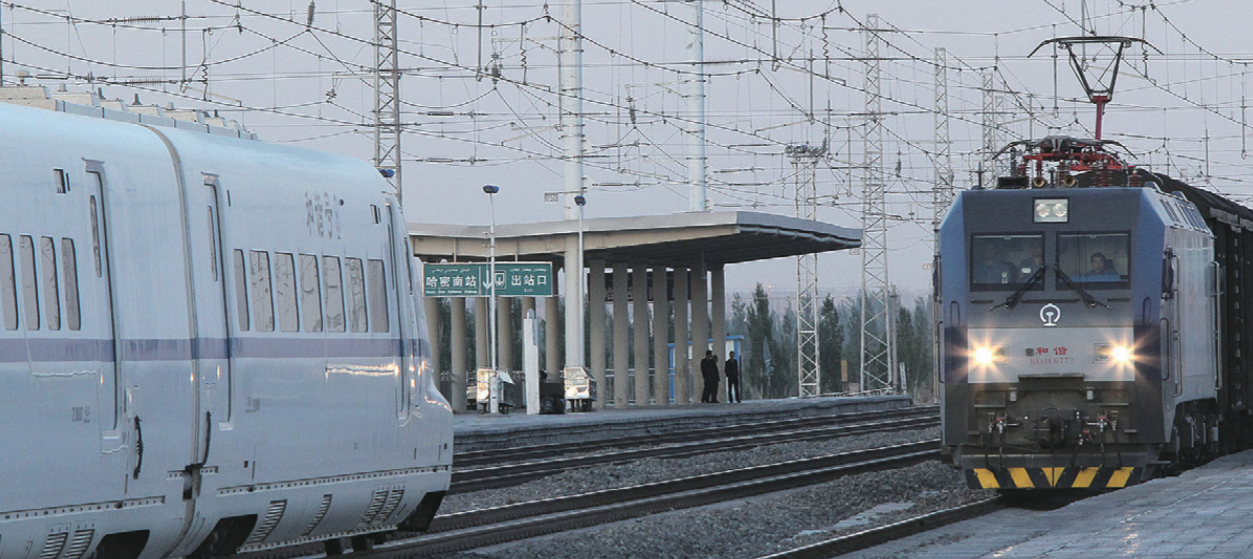 중국의 북서부는 인구가 적고, 연안부에 비해 경제적으로 발전되어 있지 않다. '간쑤성(甘肃省)'의 '란저우(蘭州)'와 '신장 위구르 자치구(维吾尔 维吾尔 自治区)'의 '우루무치(乌鲁木齐)'를 잇는 고속 철도는 2014년에 운행을 시작했다. 아래의 사진은 신장 위구르 자치구의 '하미(哈密)' 남역을 통과하는 고속 철도 차량이다.