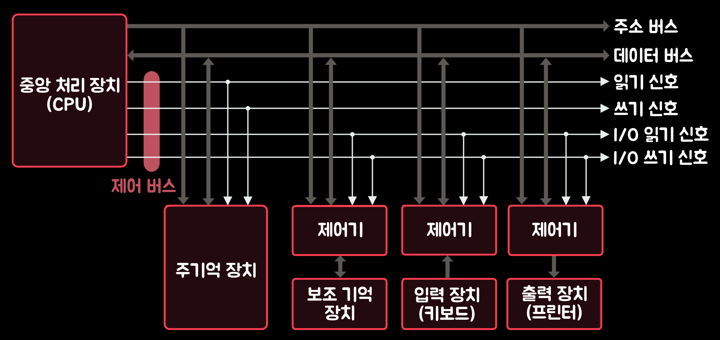 - 제어 버스(Control bus): '제어 버스'는 '중앙 처리 장치(CPU)'가 시스템 내의 각종 요소의 동작을 제어하는 데 필요한 신호선들의 집합이다. '제어 신호선'들의 개수는 컴퓨터에 따라 또는 시스템 구성에 따라 다르다. 이 중에서 중요한 것은 '기억 장치 읽기와 쓰기 신호', '입출력 장치 읽기와 쓰기 신호' 등이다. '제어 버스(Control bus)'도 단방향성이다.