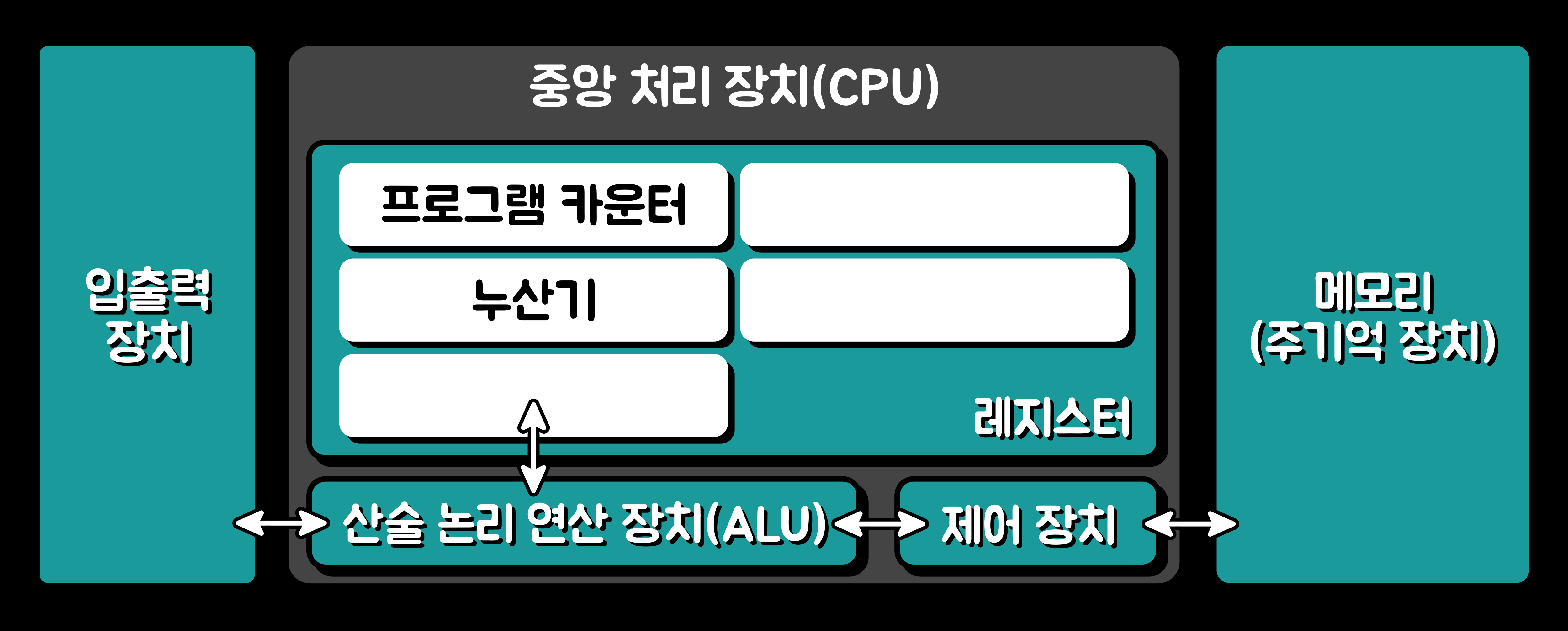 - '산술 논리 연산 장치(ALU)'는 명령을 실행하고(Execute), '레지스터'나 '메모리'에 결과를 저장한다.(Store)