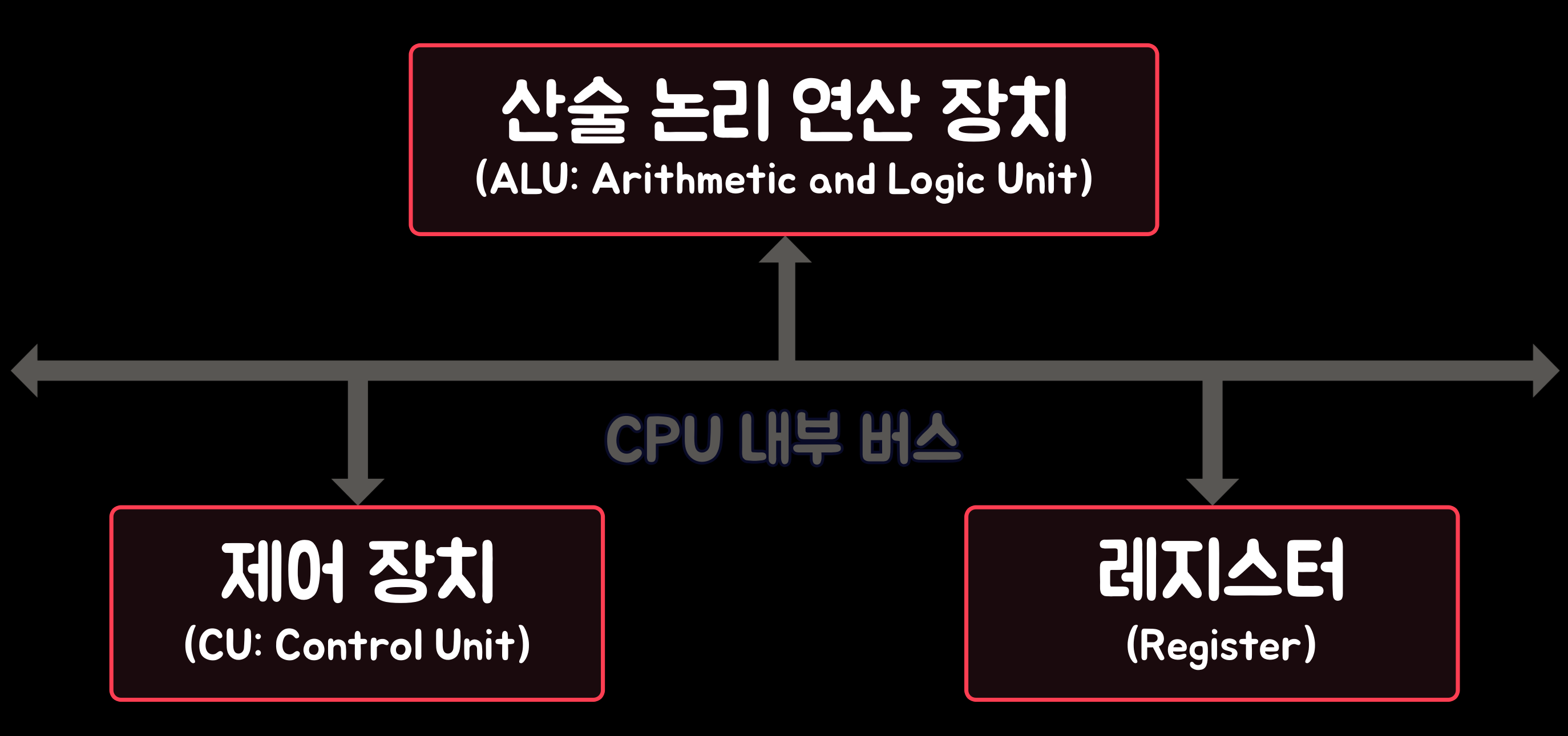 '중앙 처리 장치(CPU)'는 아래의 그림과 같이 '산술 논리 연산 장치(ALU: Arithmetic and Logic Unit)', '제어 장치(CU: Control Unit)', '레지스터(Register)'와 '내부 버스'로 구성된다. 각 구요소 간의 데이터 및 제어 신호의 이동은 CPU 내부 버스를 통해 이루어진다.