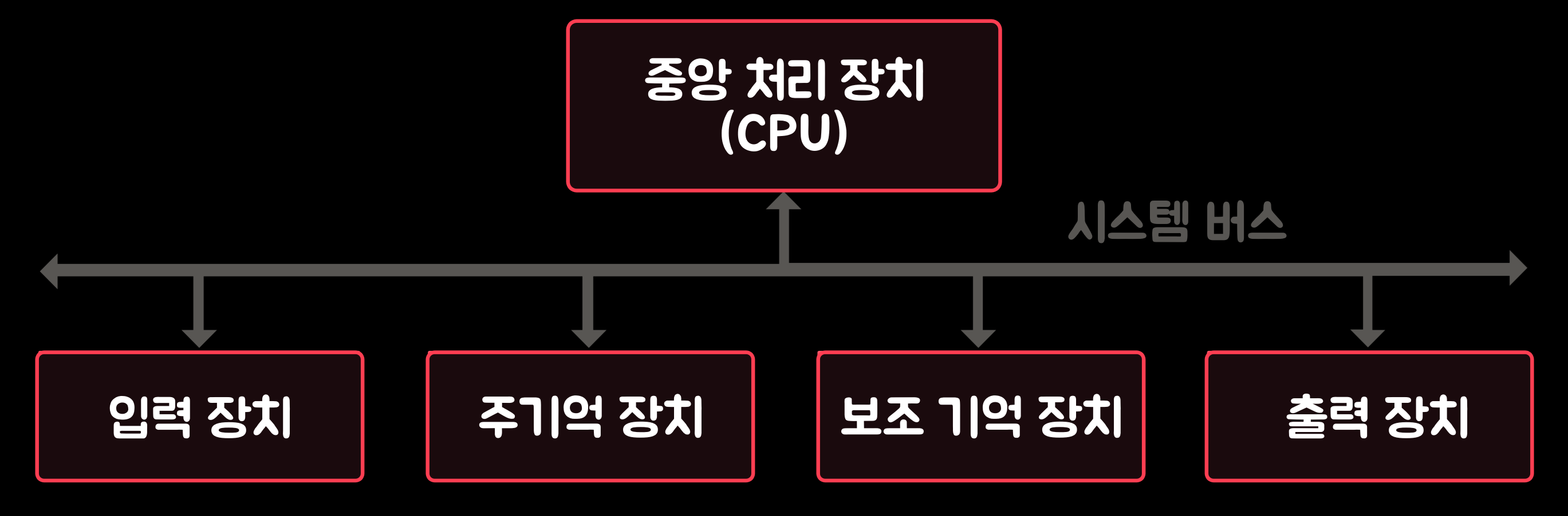컴퓨터 하드웨어는 아래의 그림과 같이 '중앙 처리 장치(CPU: Central Processing Unit)', '주기억 장치(Main Memory)', '보조 기억 장치(Auxiliary Storage Unit)', '입력 장치(Input Device)', '출력 장치(Output Device)', '시스템 버스(System bus)'로 구성된다. 컴퓨터는 사용자가 작성한 프로그램들을 정해진 순서대로 실행하는데, 이러한 기능을 수행하기 위해 각 구성 요소들은 그림과 같이 '시스템 버스'를 통해 상호 연결되어 있다.