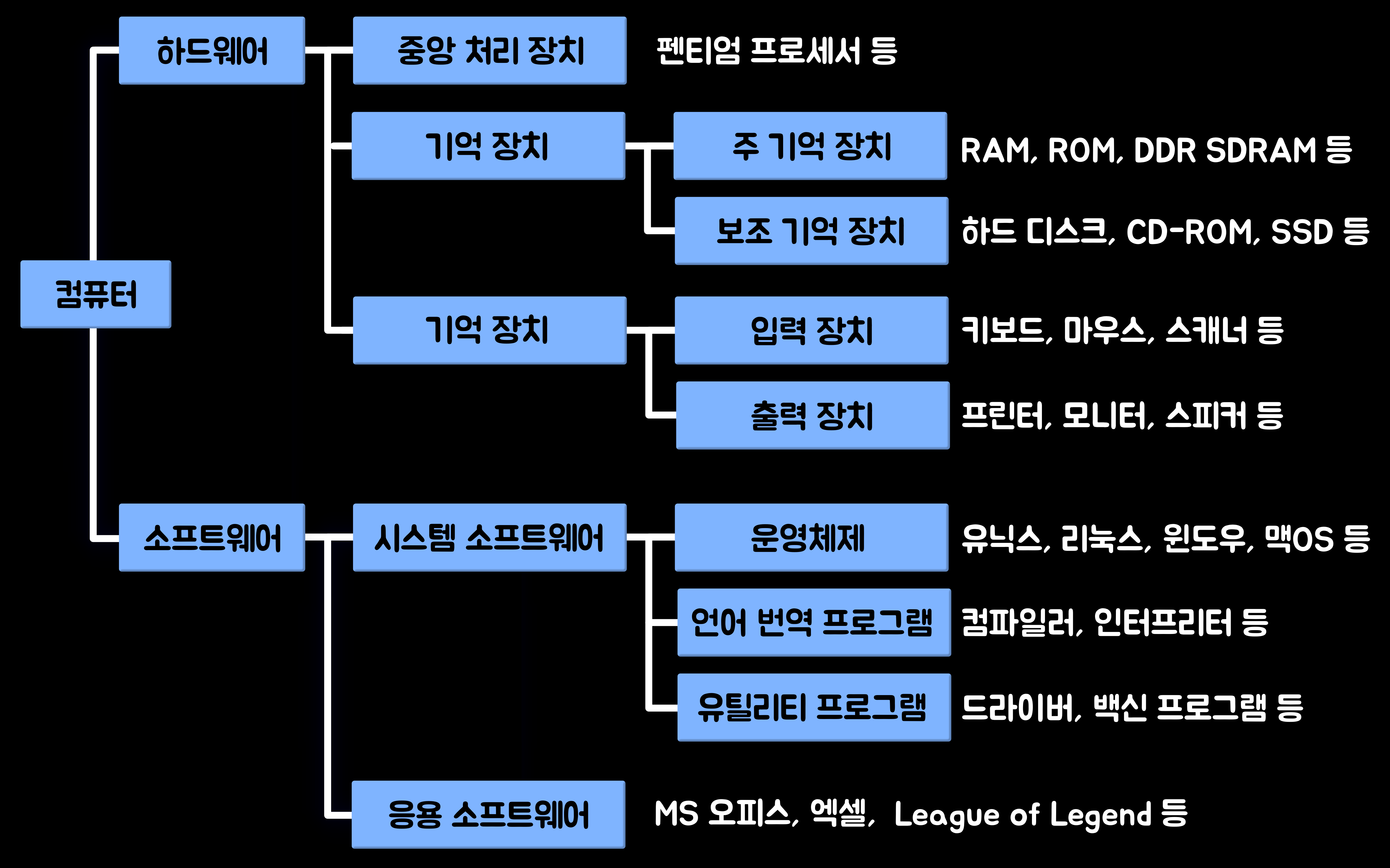 용도 예 사무용 한글, MS-office 제품군 그래픽용 포토샵(Photoshop), 페인트샵, 일러스트레이터 멀티미디어용 WinAMP, GOM Player, PowerDVD 게임용 스타크래프트(Starcraft), 워크래프트(Warcraft), GTA5, League of Legend 통신 및 네트워크용 인터넷 익스플로러, 크롬(Chrome), 모질라, 사파리, MSN 메신저, 카카오톡 4. 컴퓨터 구조(Computer Architecture)