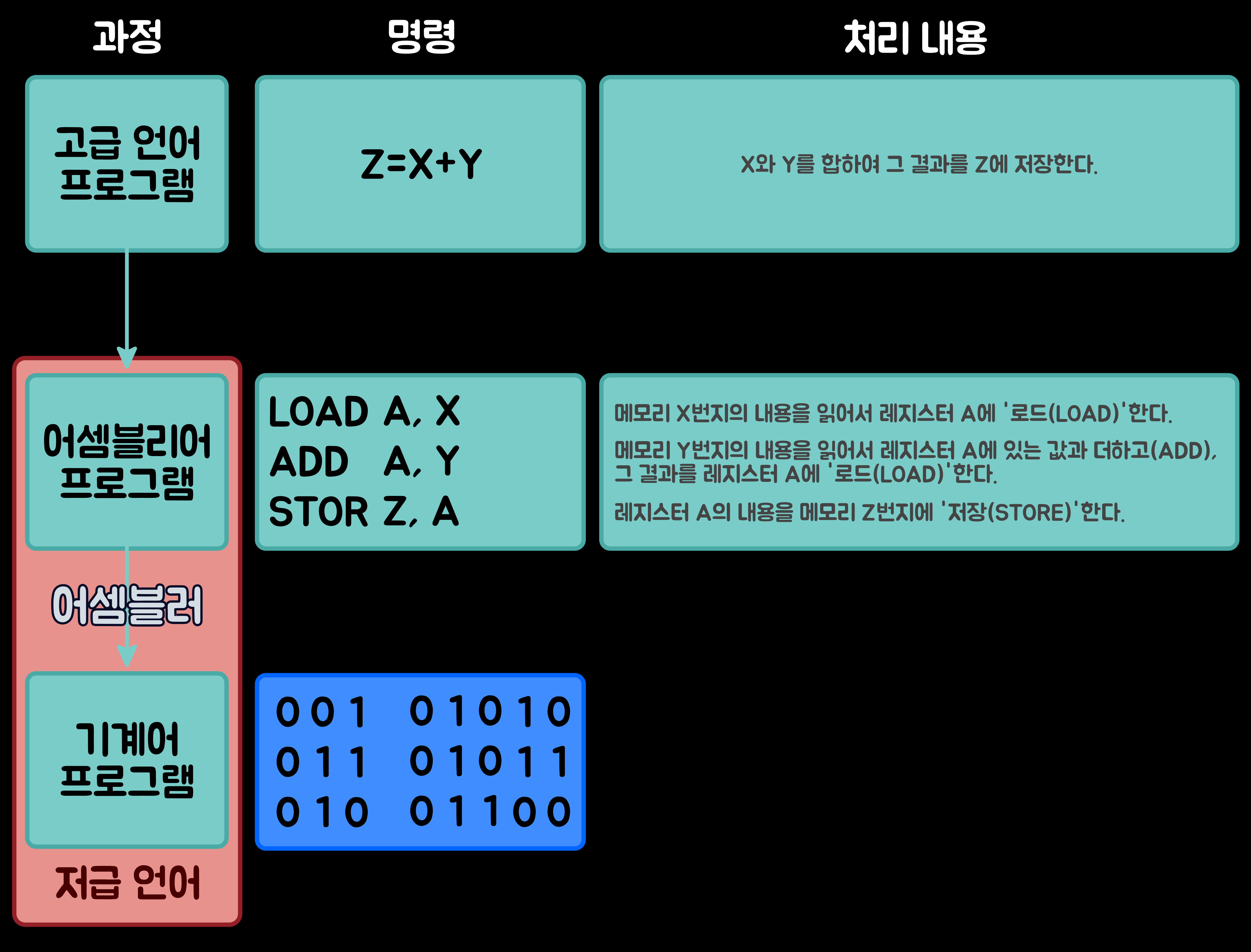 중앙 처리 장치(CPU)'는 '주기억 장치)'에 저장되어 있는 '기계어(Machine Language)'를 순차적으로 읽는다. 읽힌 기계어 중에서 앞의 3비트를 이용해 명령의 종류를 해독하는 기능은 '중앙 처리 장치(CPU)' 내부의 '제어 장치(CU: Control Unit)'에서 수행한다. 그리고 '로드(LOAD)', '저장(STOR)' 동작은 '제어 장치'에서 이에 필요한 제어 신호들을 발생시켜서 수행하고, 덧셈은 '산술 논리 연산 장치(ALU)'에서 수행한다.