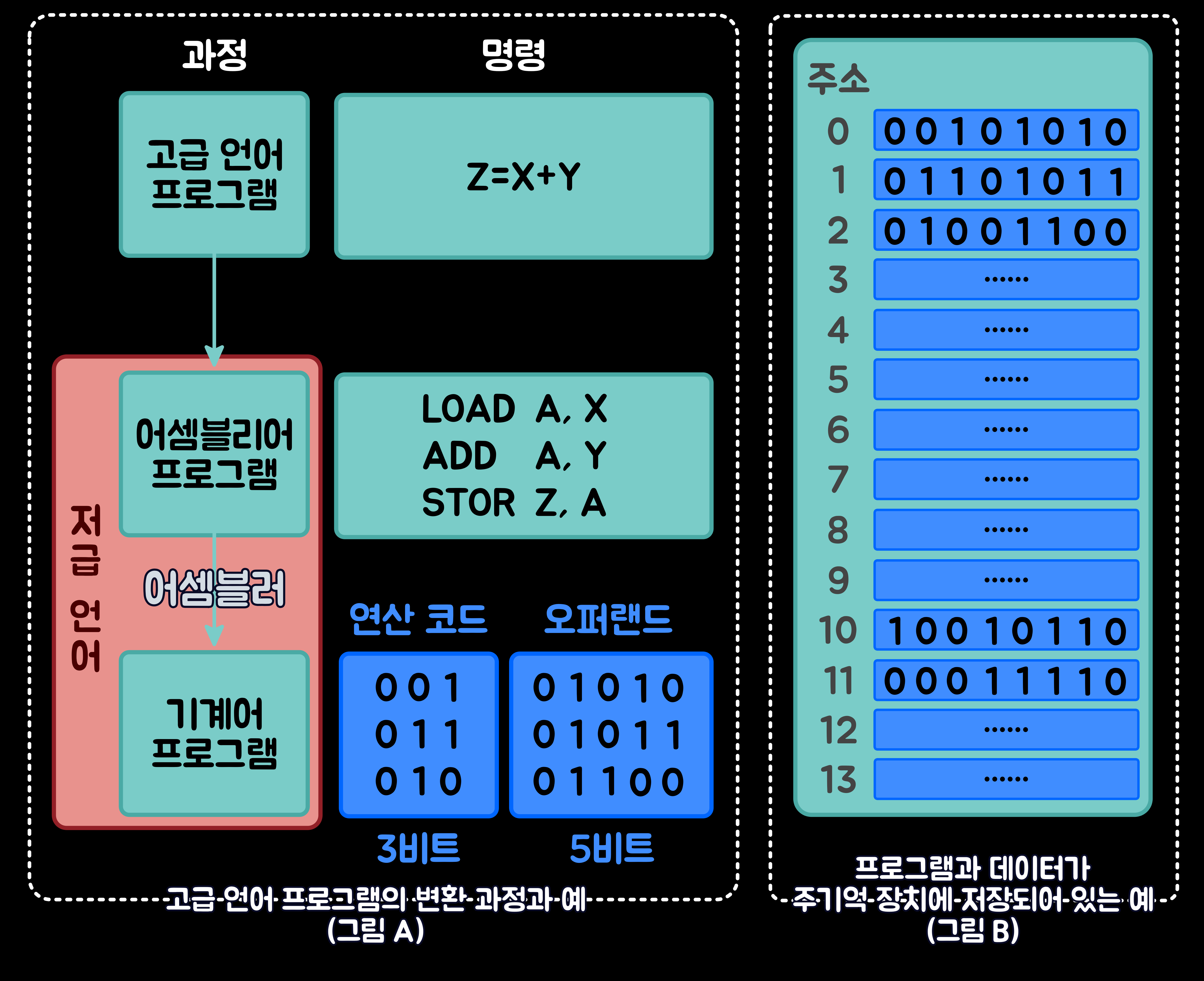 - STOR Z, A: 연산 코드 010은 레지스터 A의 내용을 저장하라'는 명령을 지정해 주는 비트고, 오퍼랜드 01100은 10진수로 12이다. 따라서 이 기계어 '010 01100'은 '레지스터 A의 내용을 메모리 12번지에 저장하라'는 의미이다.