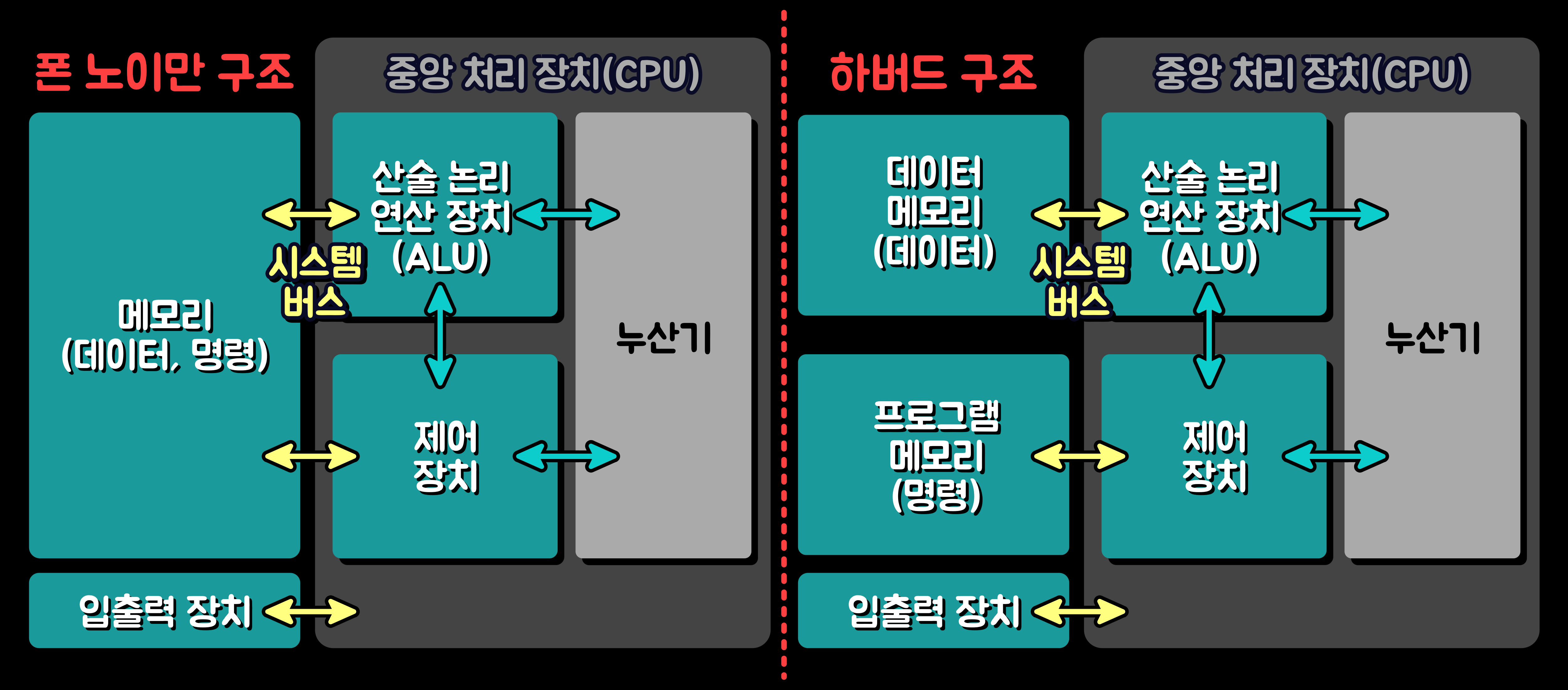 '컴퓨터 시스템(Computer System)'은 메모리 구성에 따라 '폰 노이만 구조(Von-Neumann Architecture)'와 '하버드 구조(Harvard Architecture)'로 분류한다. '폰 노이만 구조'는 명령어 메모리 영역'과 '데이터 메모리 영역'의 물리적 구분이 없어서, '중앙 처리 장치(CPU)'는 하나의 '시스템 버스(System Bus)'를 통해 메모리로부터 명령어나 데이터를 읽거나 쓴다. 그래서 '폰 노이만 구조'에서는 구조적으로 '시스템 버스'에 병목이 발생한다.