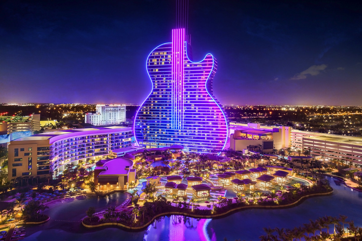 '플로리다 주(Florida State)'에 있는 '세미놀 하드록 호텔 & 카지노 할리우드(Seminole Hard Rock Hotel & Casino Hollywood)'는 카지노와 클럽, 쇼핑몰 등이 들어선 '복합 리조트(IR: Intergrated Resort)' 시설인데, 그 중심이 전면을 유리로 채운 기타 모양의 호텔이다. 2019년에 문을 열었으며, 높이는 137m의 34층 건물로, 638개의 객실이 있다. 밤에는 매일 빛과 음악을 이용한 쇼가 열린다. 호텔 전체가 LED로 장식되어 있으며, 현을 상징하는 6개의 레이저광이 6000m 이상의 상공까지 투사된다.
